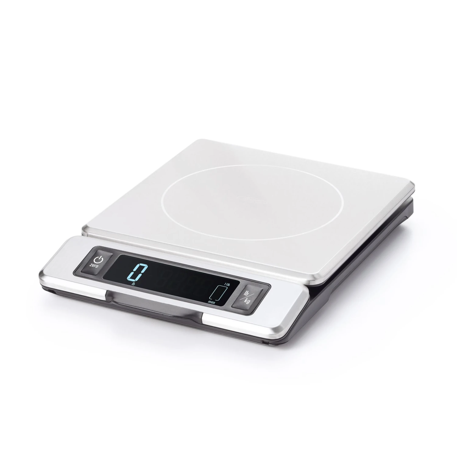 The OXO Good Grips 11 lb Scale can add and weigh without getting in the way. Simply pull the easy-to-read display out to use – the innovative design prevents shadowing from bowls or plates – and slide the display back in for compact storage. The Scale features a zero function and a unit conversion button to measure in 0.1-oz (US) and 1-g (metric) increments for greater accuracy.