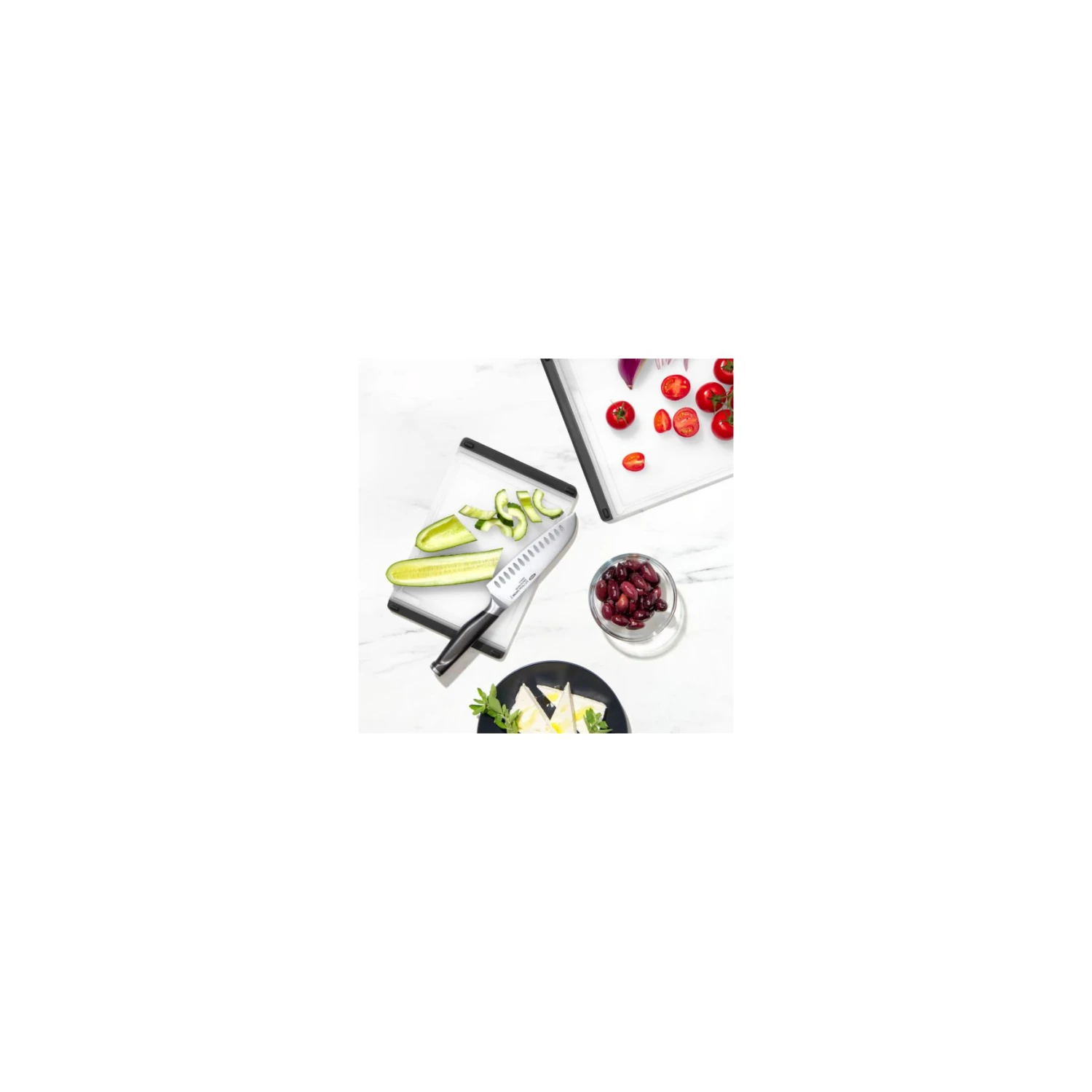 The OXO 2-Piece Cutting Board Set is a dynamic kitchen duo ideal for everyday meal prep. Non-porous surfaces lock out odors for a fresh cutting surface that resists deep scratches and goes easy on your knives. Double-sided boards have a grooved side for meat and a solid side for produce. Soft, tapered edges double as a comfortable handle, while non-slip feet keep the board in place as you slice. The smaller Prep Board is perfect for trimming vegetables, while the Everyday Board is ideal for making meals. Both are dishwasher safe.