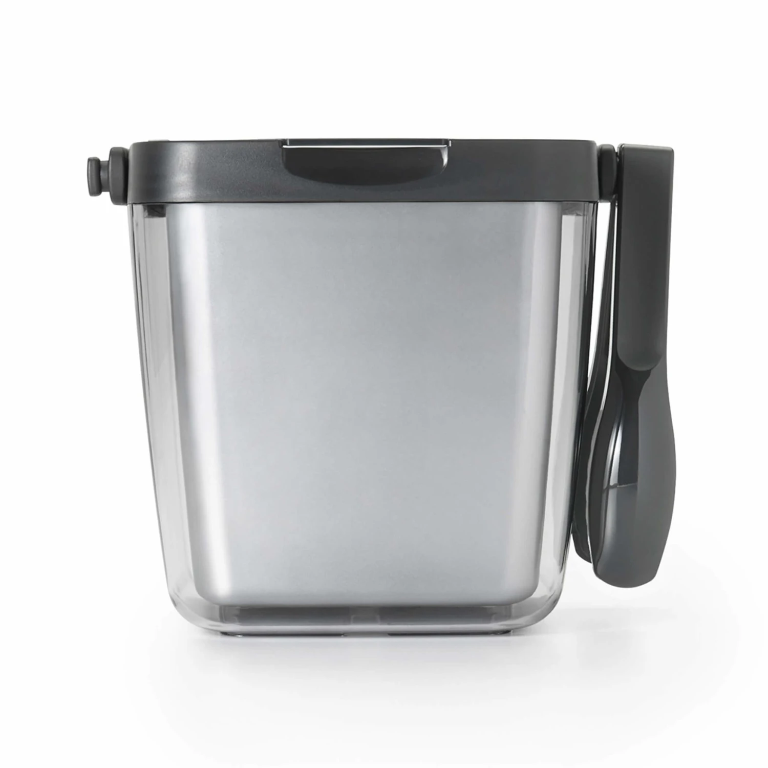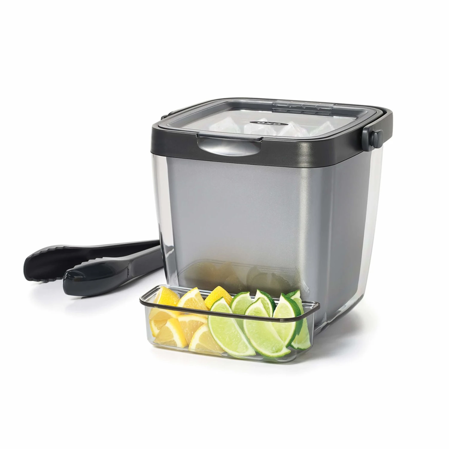 Be prepared for any party, inside or out, with this insulated Ice Bucket. Includes nylon tongs that hang conveniently from either side and a removable tray that holds drink garnishes. The carrying handle stays out of the way when not in use and the meltwater reservoir keeps meltwater away from cubes.