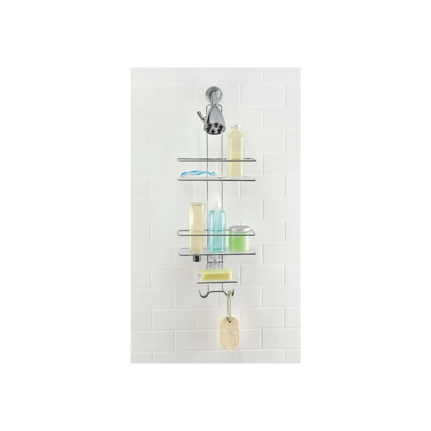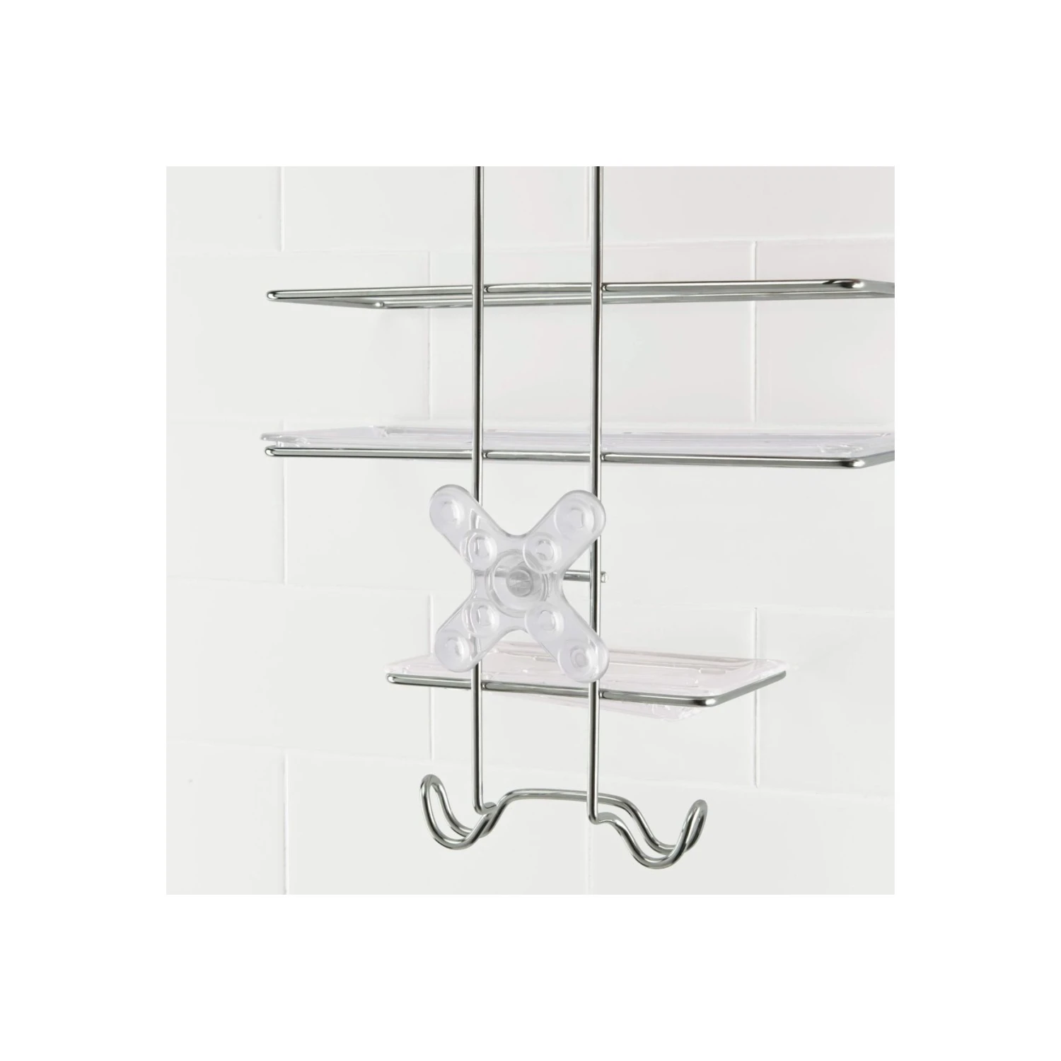 This sturdy, stainless steel Shower Caddy features built-in hooks, perfect for storing razors and loofahs, and trays with holes for storing bottles upside down. The pivoting StrongHold™ hook holds the Shower Caddy securely in place, and the PVC-free suction cups add stability.