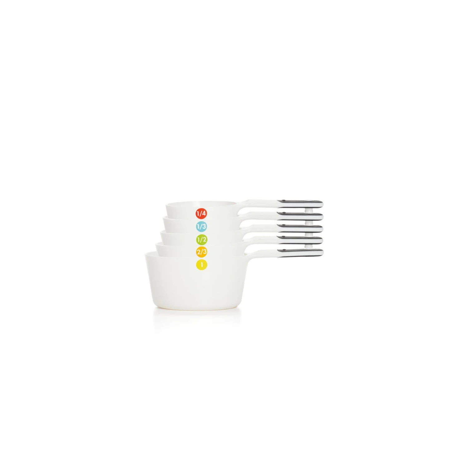 The 6 Piece Measuring Cups snap together so you can take out only what you need, leaving the rest neatly together. Handles have soft, comfortable non-slip grips and permanent measurement markings. Color-coded, easy-to-read measurements on the side help you find the right sized cup faster.