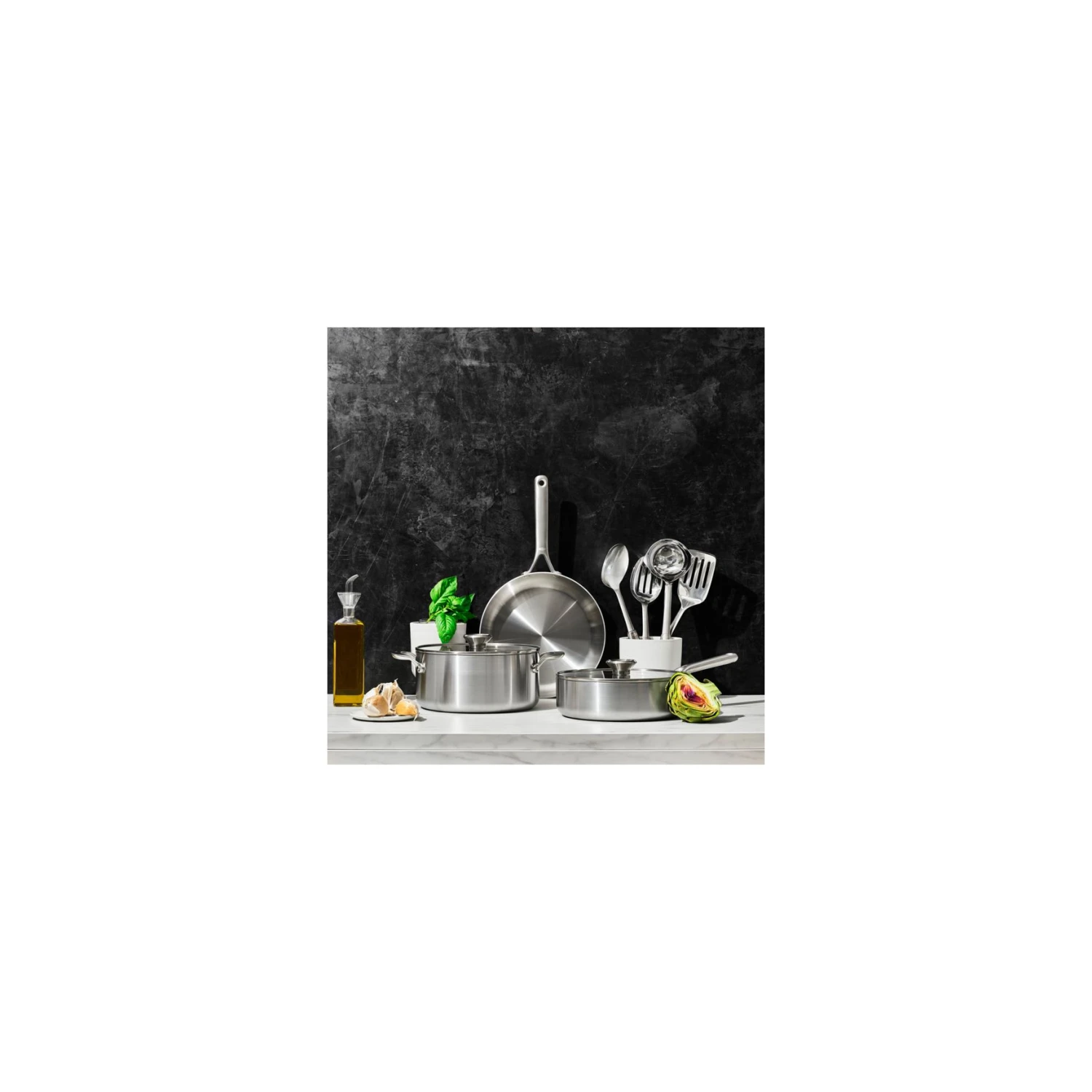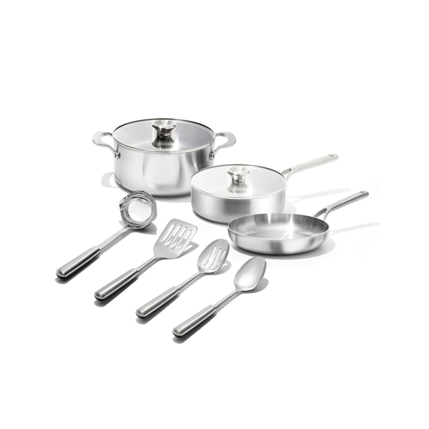 Complete your kitchen with the OXO Steel 4-Piece Utensil Set, plus OXO Mira Series stainless steel cookware collection. Each stainless steel tool features a sleek design and a comfortable non-slip grip. This bundle includes one of each: Spoon, Slotted Spoon, Ladle and Turner. The OXO Tri-Ply Stainless Mira Series features two layers of stainless steel with an aluminum core for uniform cooking. The set includes the 10-in Frypan, 3.3 Qt Sauté Pan with Lid and 5.2 Qt Casserole with Lid.