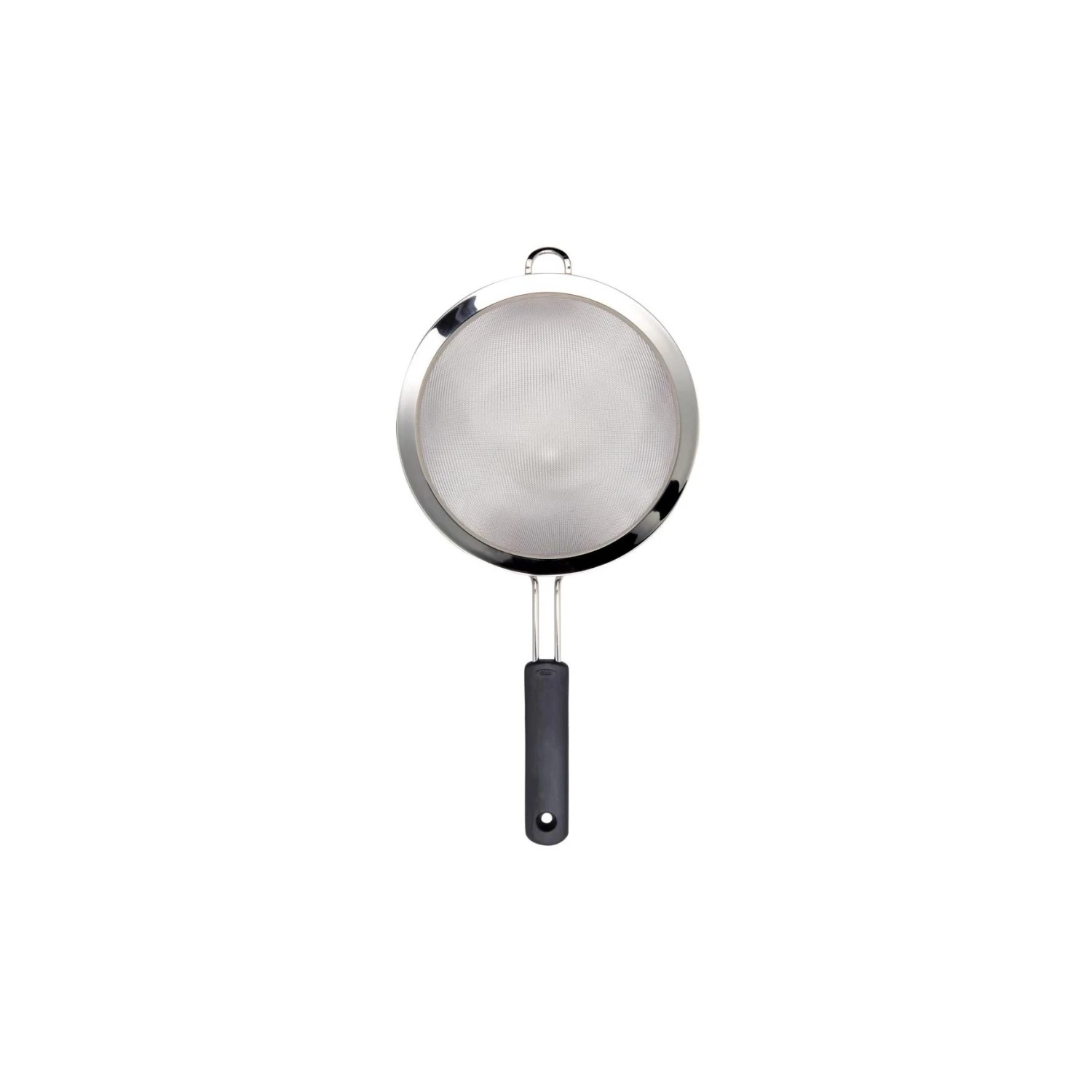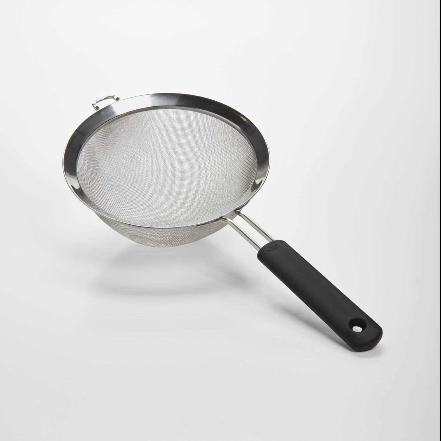 The fine mesh Strainer is ideal for rinsing and straining vegetables, berries, pasta and more. Stainless steel double rod construction makes it extra sturdy, and a small loop lets it rest on a pot or bowl. The soft, comfortable handle won’t slip, even when wet. Also available in 6″ size.