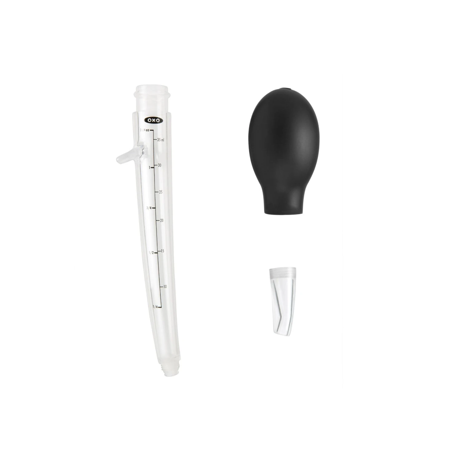 Thanks to its angled tip that easily draws in basting juices, this Baster can get into pans and ovens without putting your hands too close to the heat. The round silicone bulb is comfortable to squeeze from any angle, and the measurement markings are easy to read. An integrated stand keeps it from rolling around on the counter.