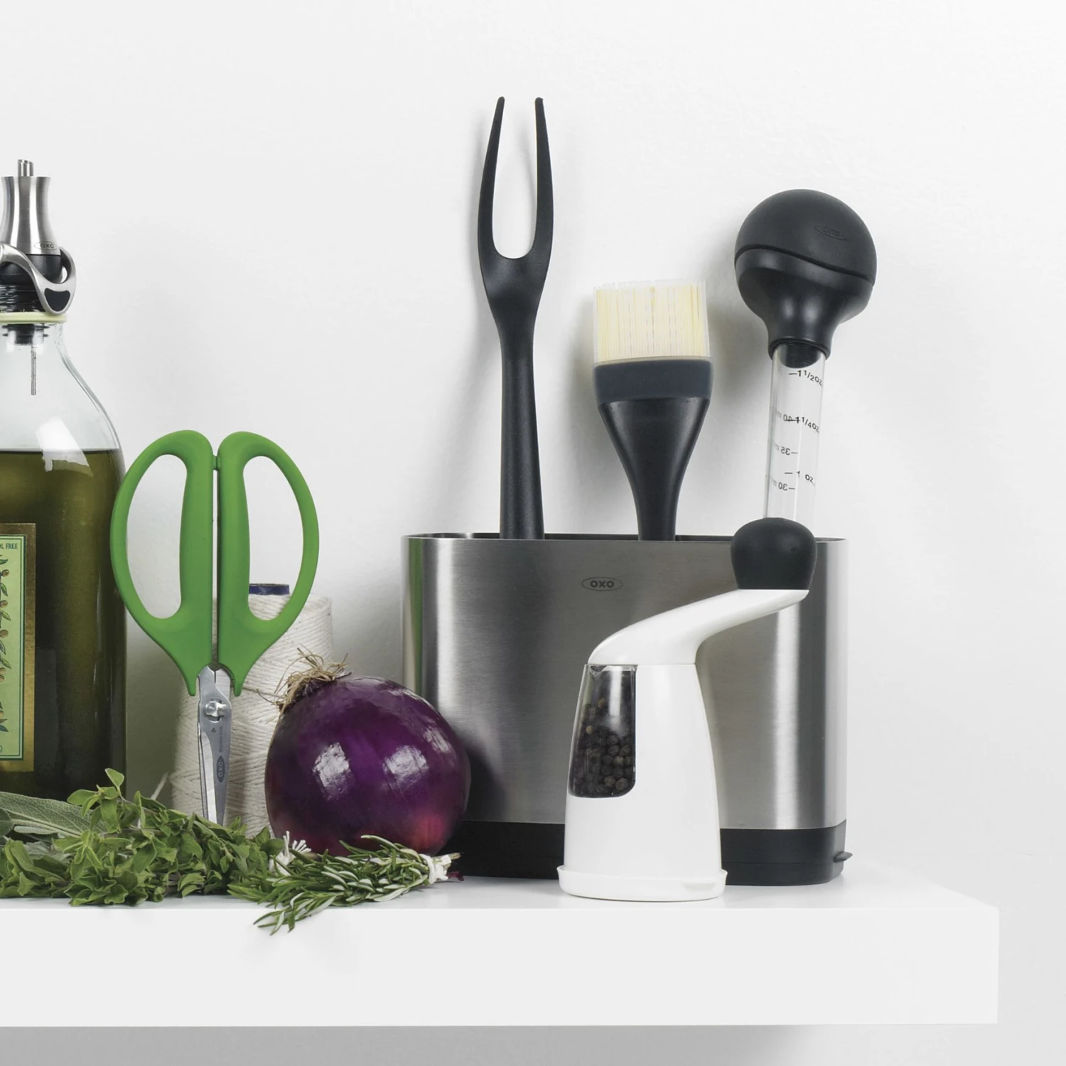 The Silicone Basting Brush’s multi-layered bristles work as if they are natural but have heat resistance and quick-clean convenience. Gaps in the center bristles hold liquid as you transfer, and tapered outer bristles let you baste with ease.