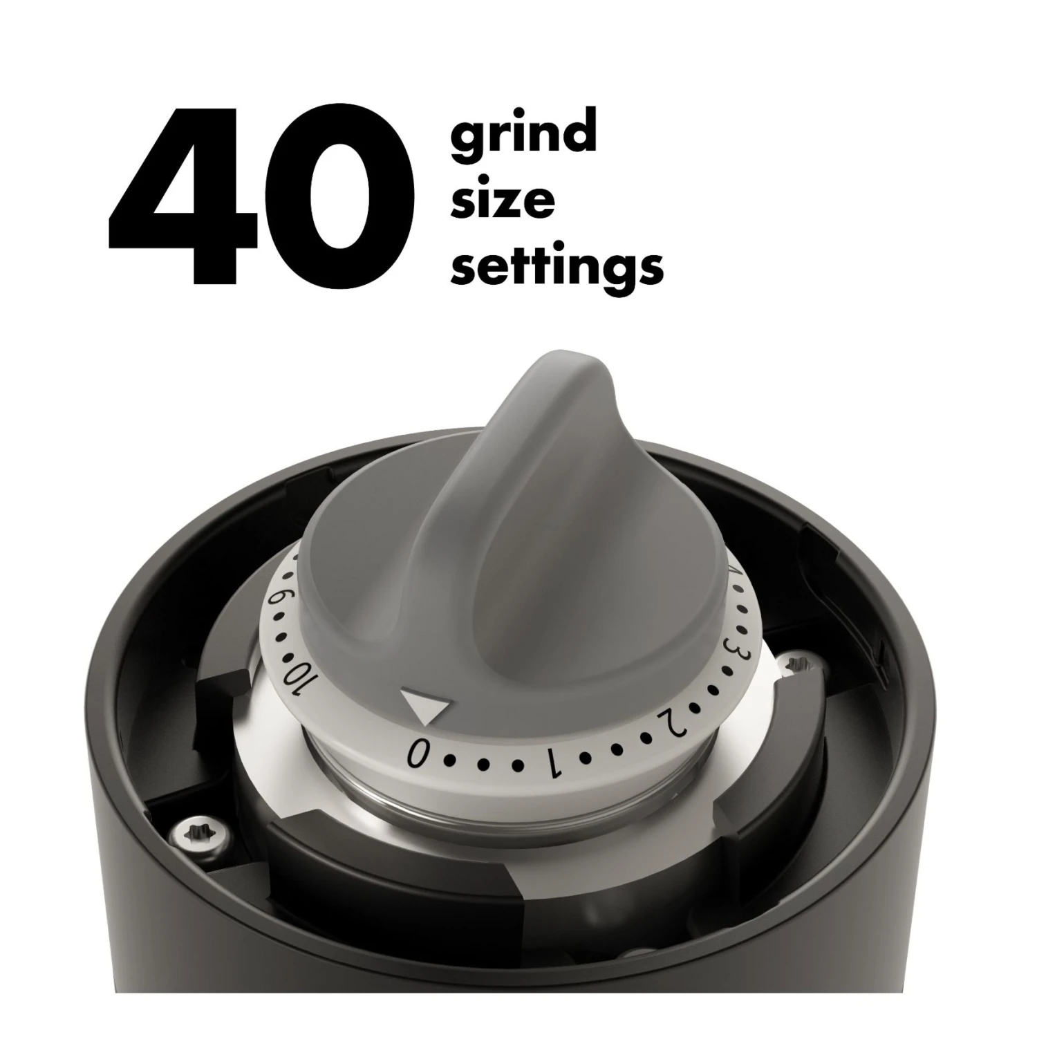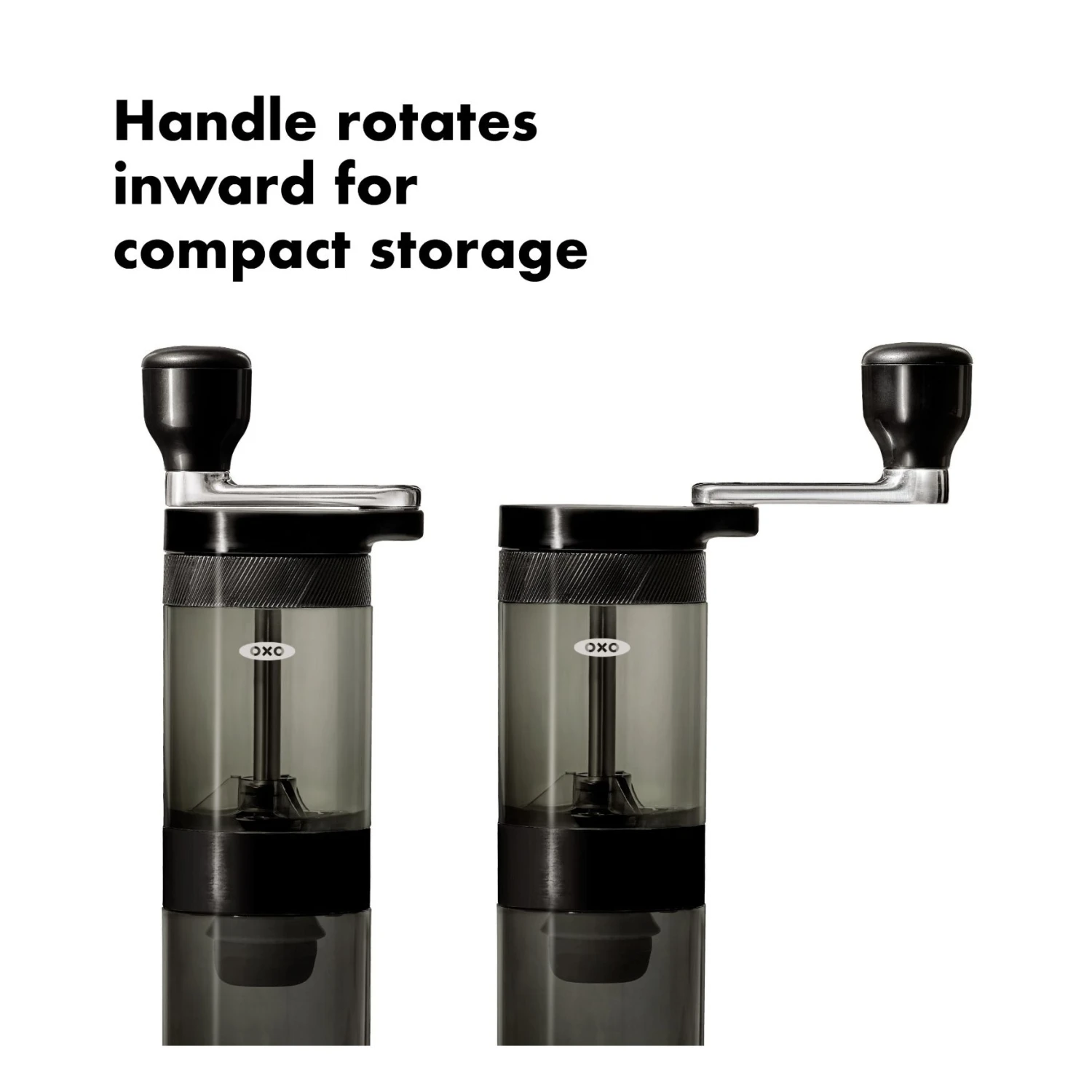- Comfort grip handle rotates out to grind, back in for easy storage
