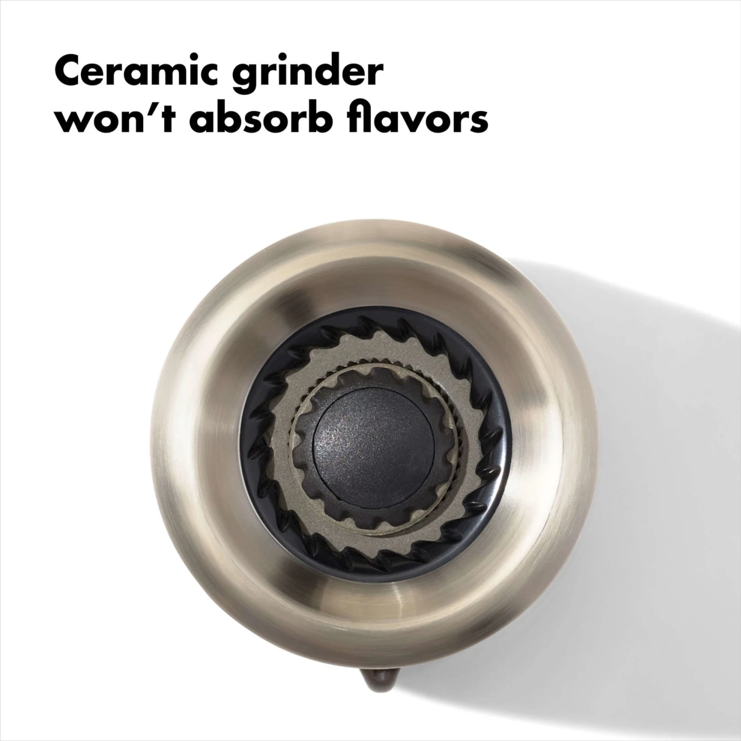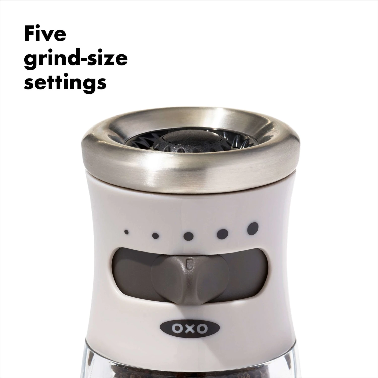 The OXO Good Grips Contoured Mess-Free Pepper Grinder dispenses from the top, for less mess on your counters. Slide the tab to choose from five grind-size options. Made from non-corrosive ceramic, the durable grinder mechanism won’t absorb flavors or odors, so it works for all types of peppercorns, salts, and whole spices like cumin, coriander and cloves. An airtight lid keeps spices fresh and dry while the non-slip grip on the base allows for easy, comfortable use. Our manual Grinder has stainless steel accents and a clear acrylic body, so you’ll know when it’s time to refill. Comes filled with black peppercorns. Hand wash only.
