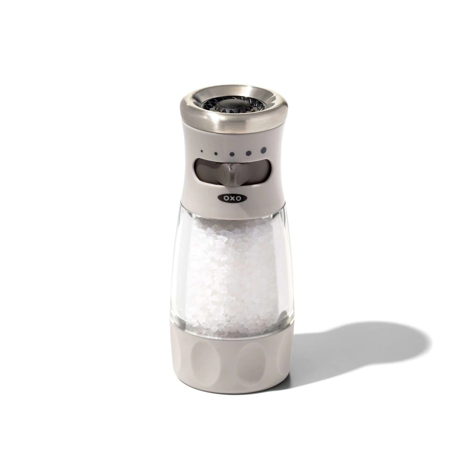 The OXO Good Grips Contoured Mess-Free Salt Grinder dispenses from the top, for less mess on your counters. Slide the tab to choose from five grind-size options. Made from non-corrosive ceramic, the durable grinder mechanism won’t absorb flavors or odors, so it works for all types of peppercorns, salts, and whole spices like cumin, coriander and cloves. An airtight lid keeps spices fresh and dry while the non-slip grip on the base allows for easy, comfortable use. Our manual Grinder has stainless steel accents and a clear acrylic body, so you’ll know when it’s time to refill. Comes pre-filled with coarse salt. Hand wash only.