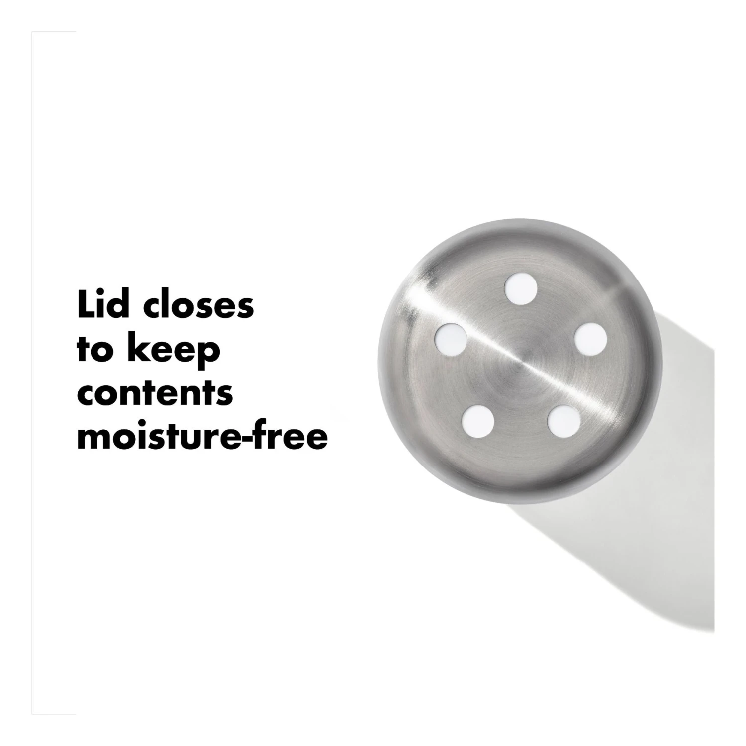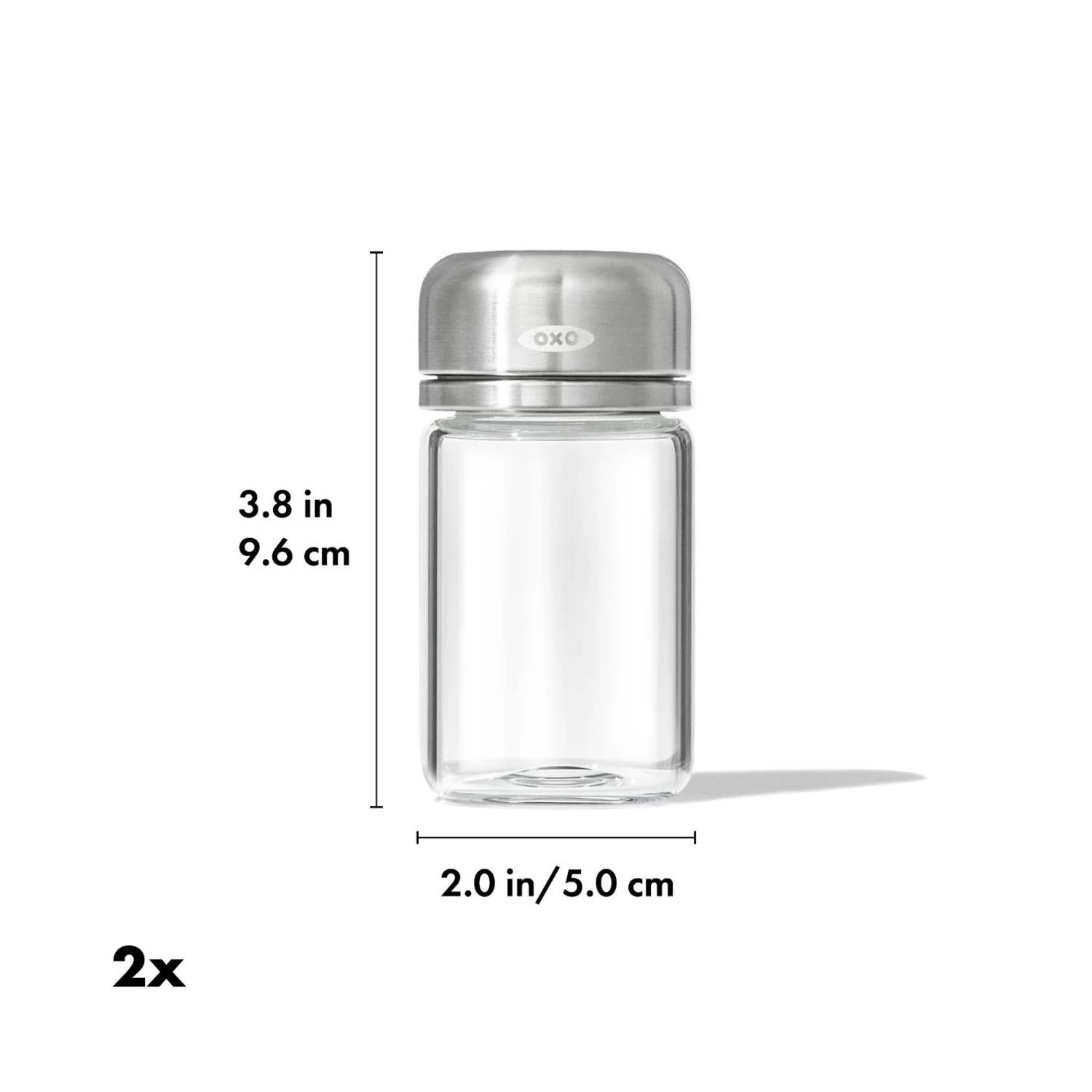 Whether you’re in the midst of cooking or simply need to salt your meal, with adjustable lid settings the OXO Glass Adjustable Shaker Set has you covered. We took a thoughtful approach to this salt and pepper set, providing you with a multi-setting lid that has adjustable hole sizes so you can get your seasoning just right. The one hole setting releases more while your cooking while the three-hole setting releases less, perfect for when you’re seasoning meals and snacks. The closed setting protects contents from moisture to ensure longer life span. Plus, we’ve designed our lid with audible clicks so you know when you’re reached the right setting. Each shaker holds 3.5 oz of salt or pepper. Hand wash lid, body is dishwasher safe.