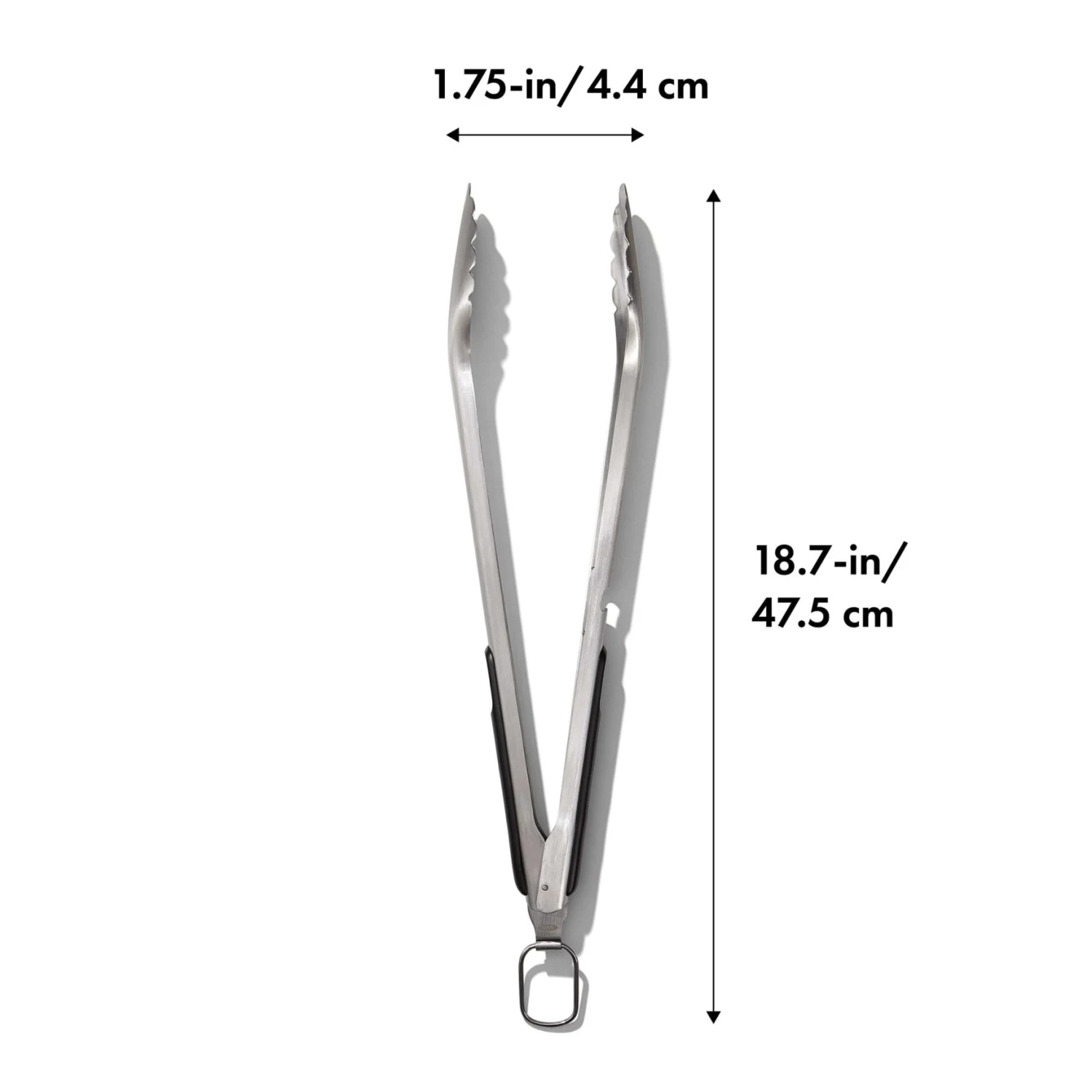 With heavy-duty stainless steel construction and a smart, scalloped head design, the OXO Good Grips Grilling Tongs with Built-In Bottle Opener are sure to be your grilling go-tos. Angled heads grab and hold onto everything from thick cuts of meat to corn on the cob for fumble-free flipping, turning, and transferring. The handle has a built-in bottle opener for ultimate convenience and an extra-long design to keep hands safely away from heat. Pull the ring to lock the Tongs closed and hang right by the grill for storage. Dishwasher safe.