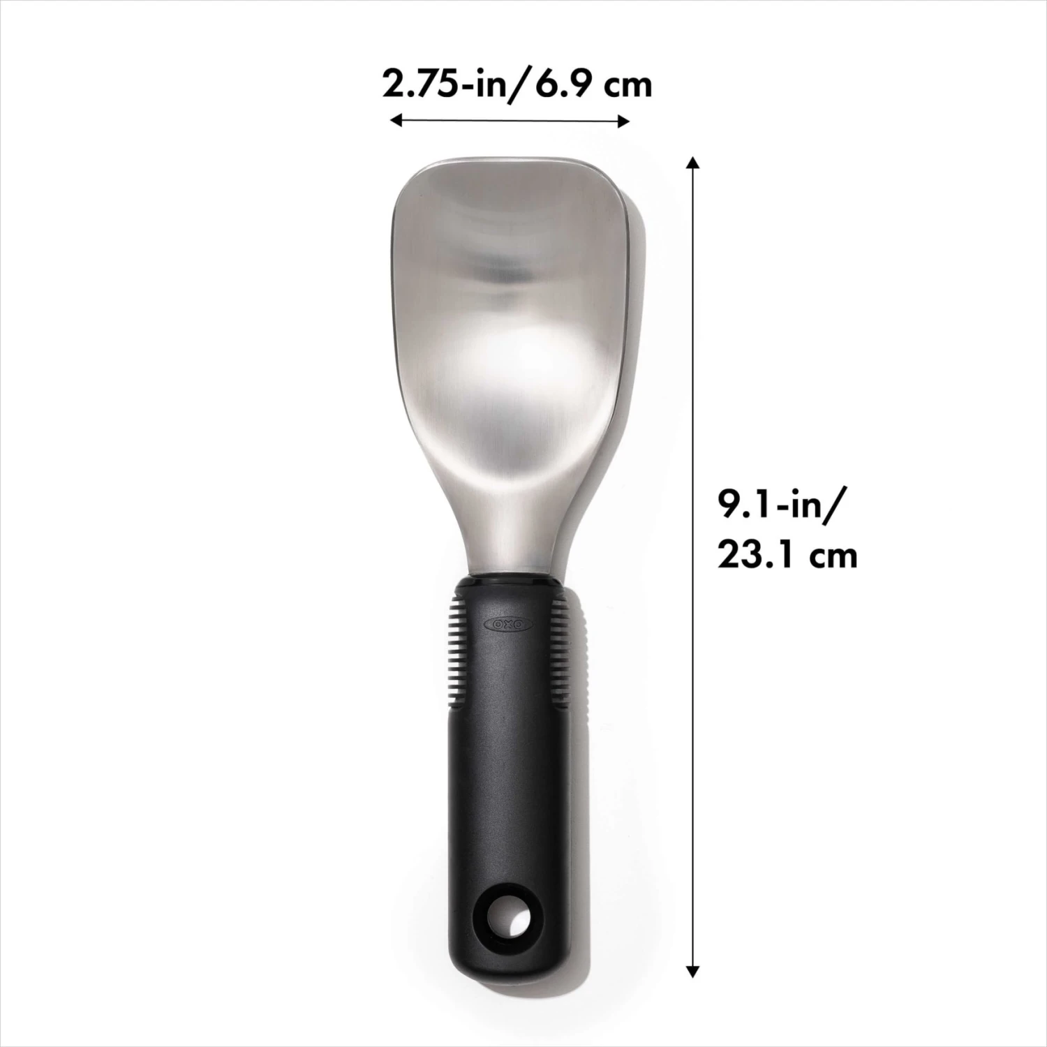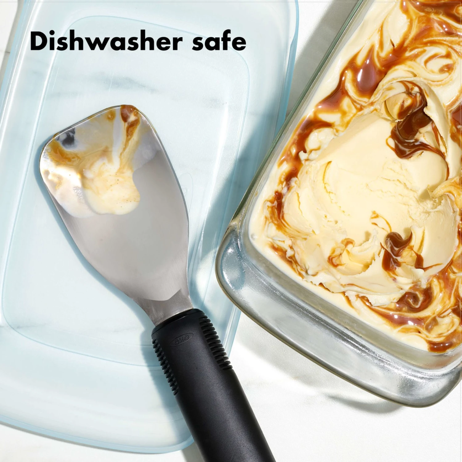 Dish out ice cream for a crowd with the OXO Good Grips Ice Cream Spade. It has a wide, stainless steel head that’s perfect for scooping large servings of ice cream and durable enough for packing pints. The soft, non-slip handle stays comfortable—and won’t get cold during use. Dishwasher safe.