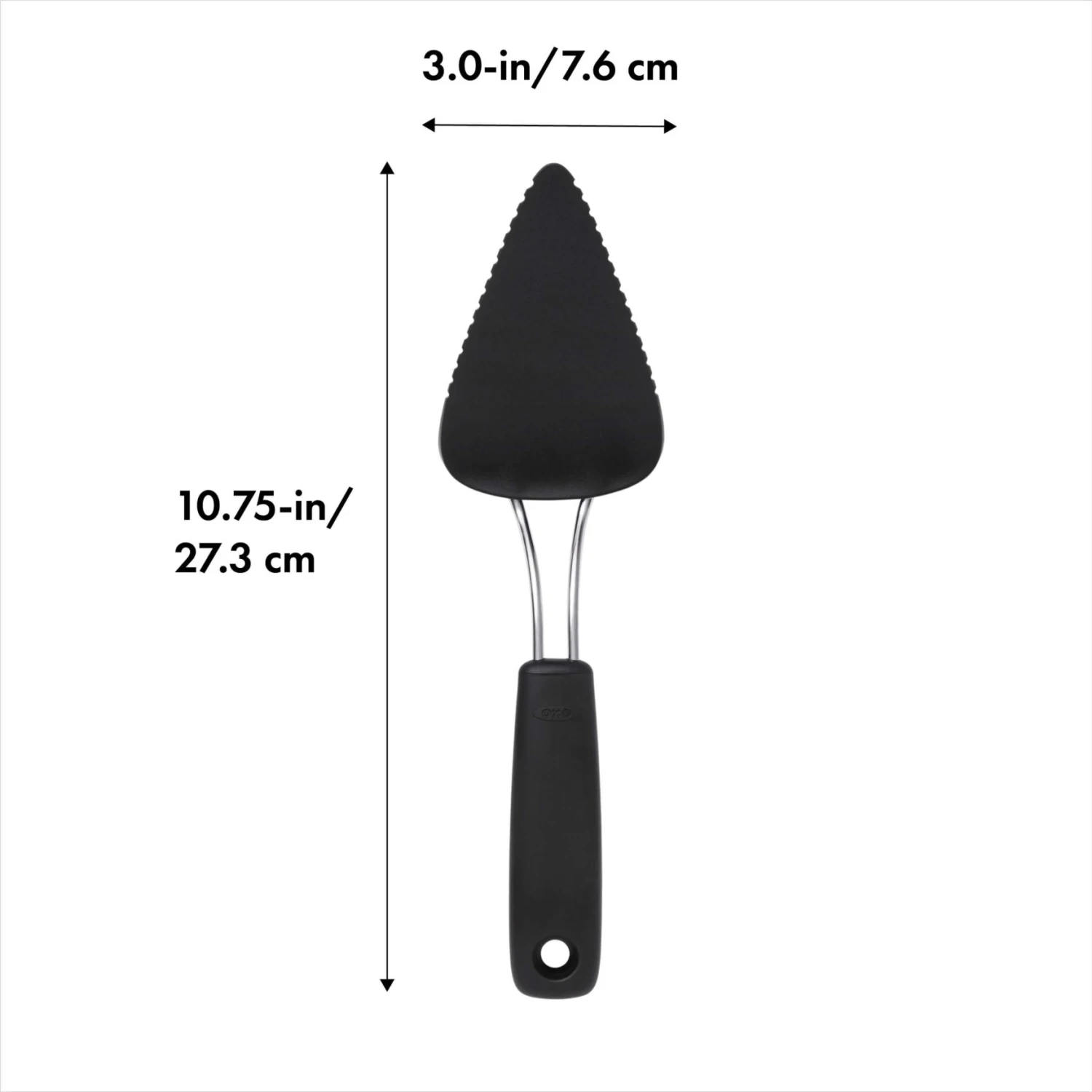With serrated edges on both sides, our Pie Server makes it easy for righties and lefties to slice pie. The flexible nylon head slides easily beneath each portion, so even the first piece comes out clean. Heat resistant to 450°F. A non-slip handle provides a firm grip.