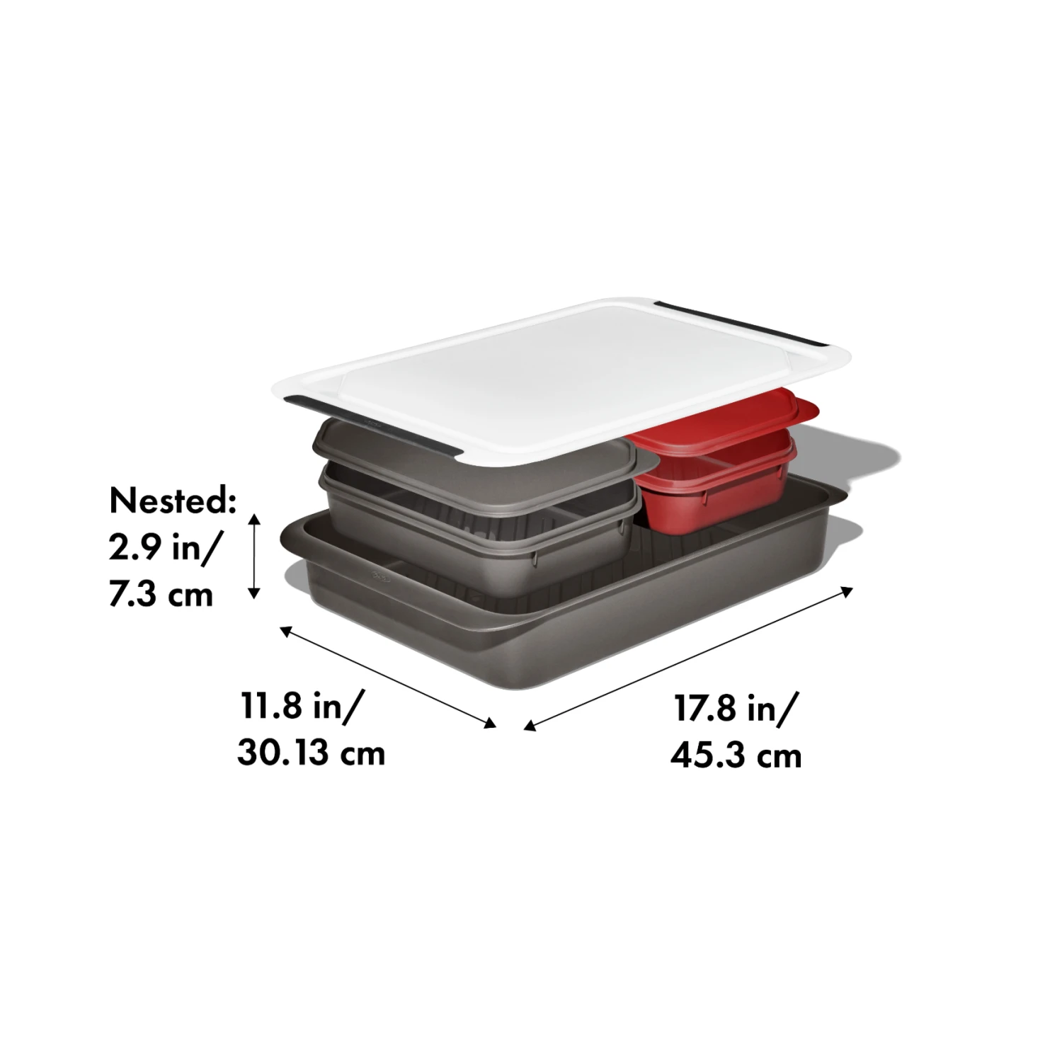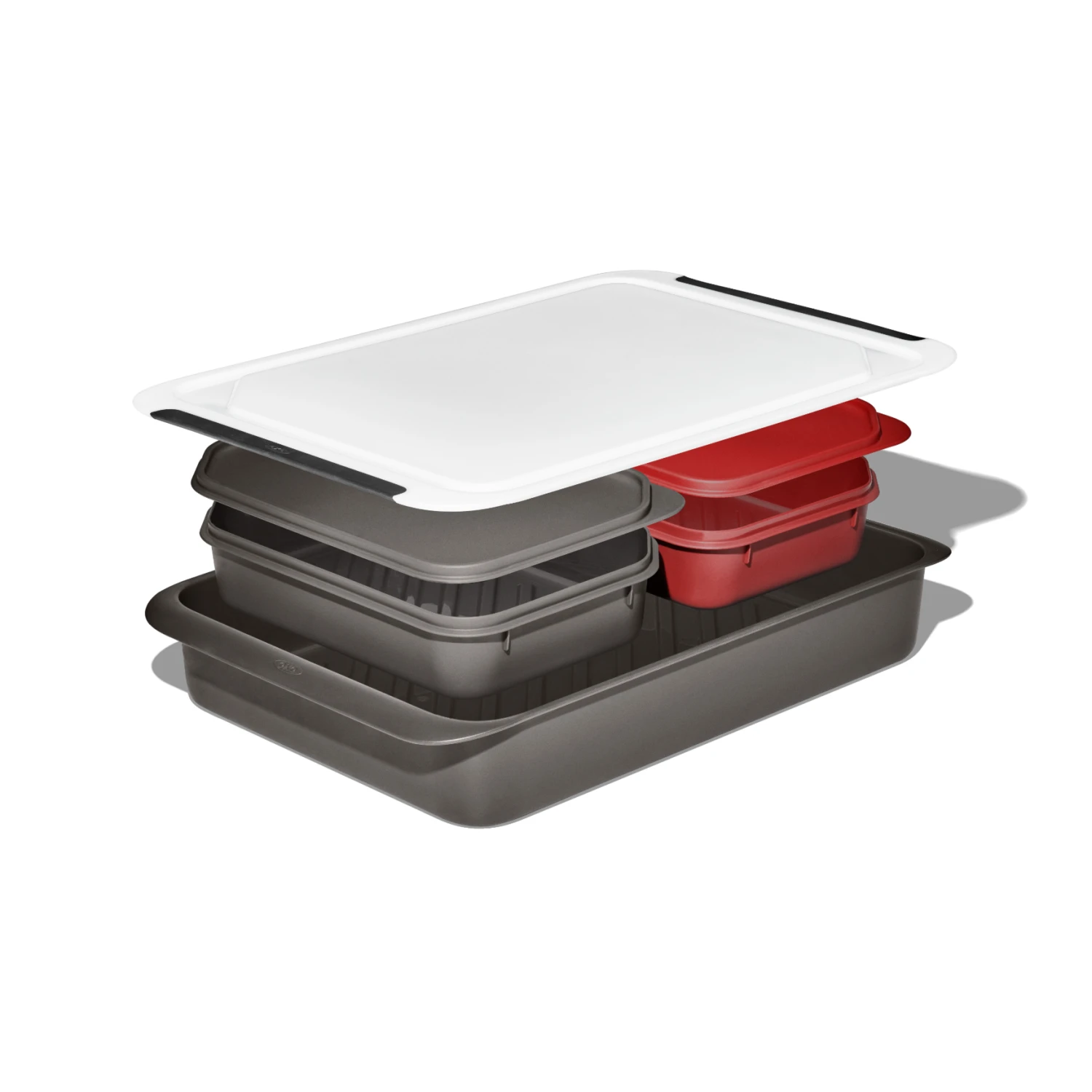 - 6-piece set includes Cutting Board, Deep Tray, two Trays with Lids
