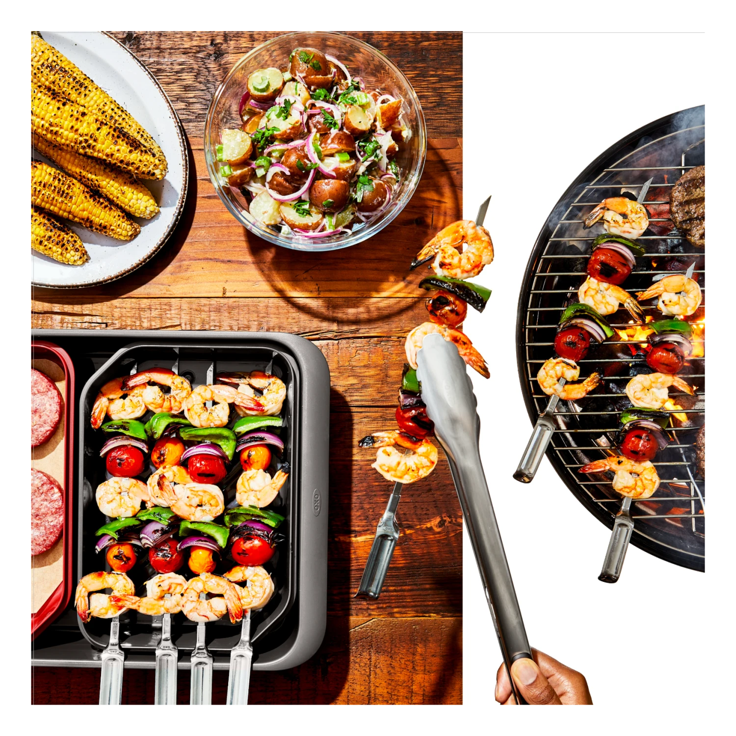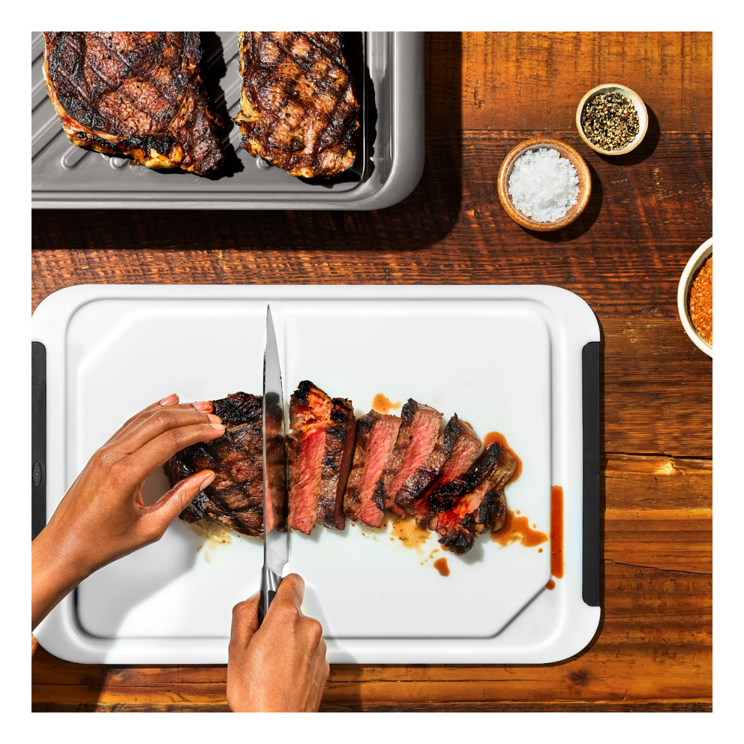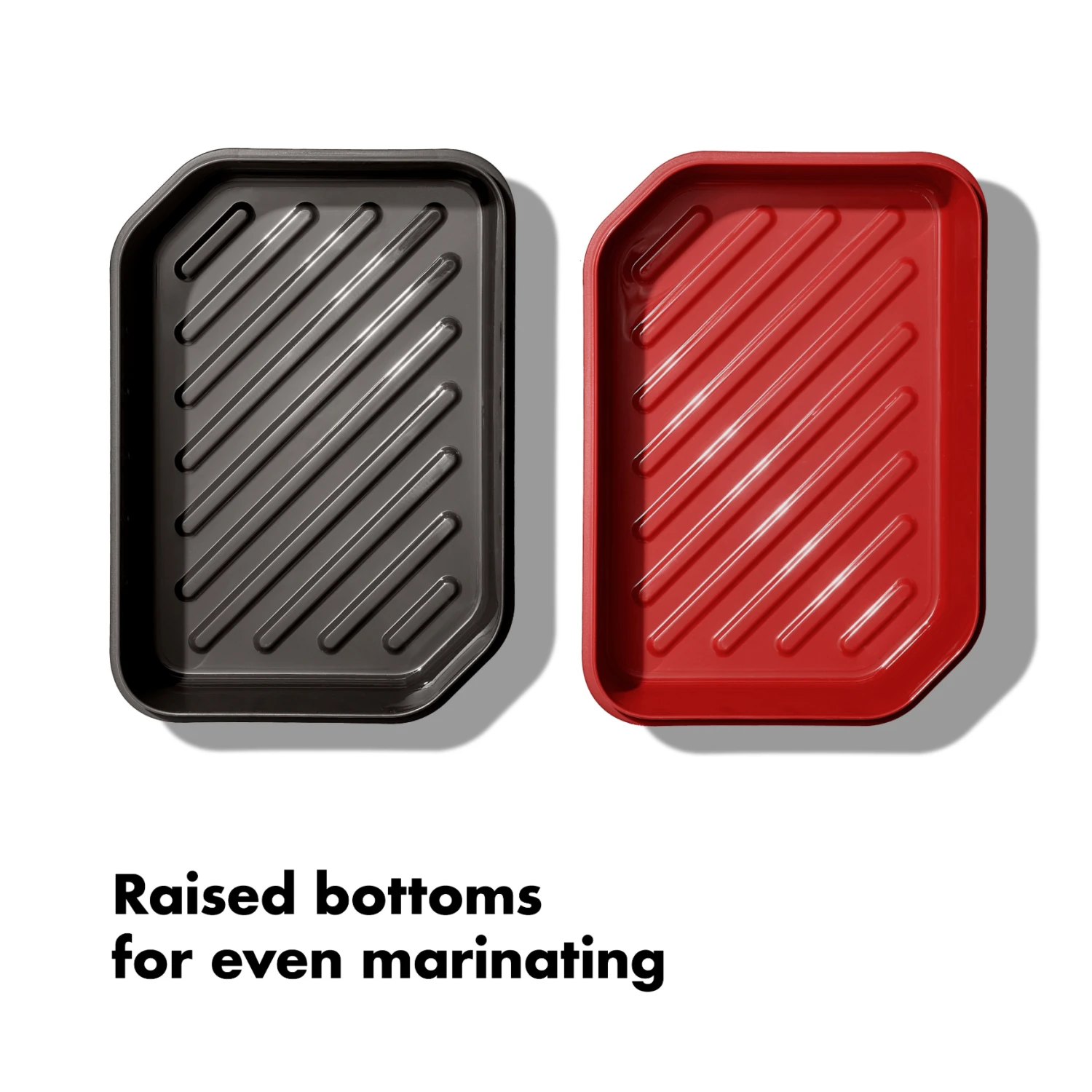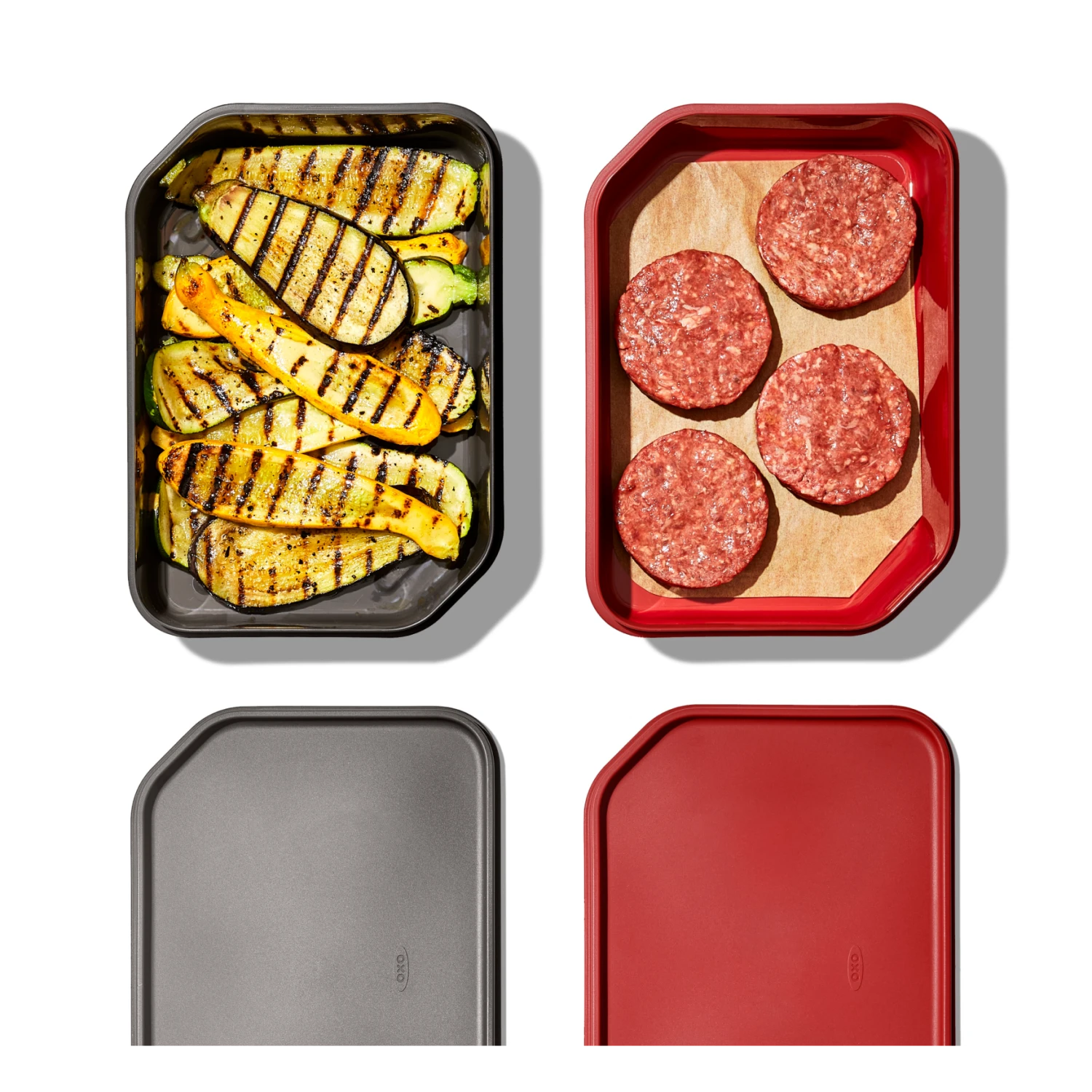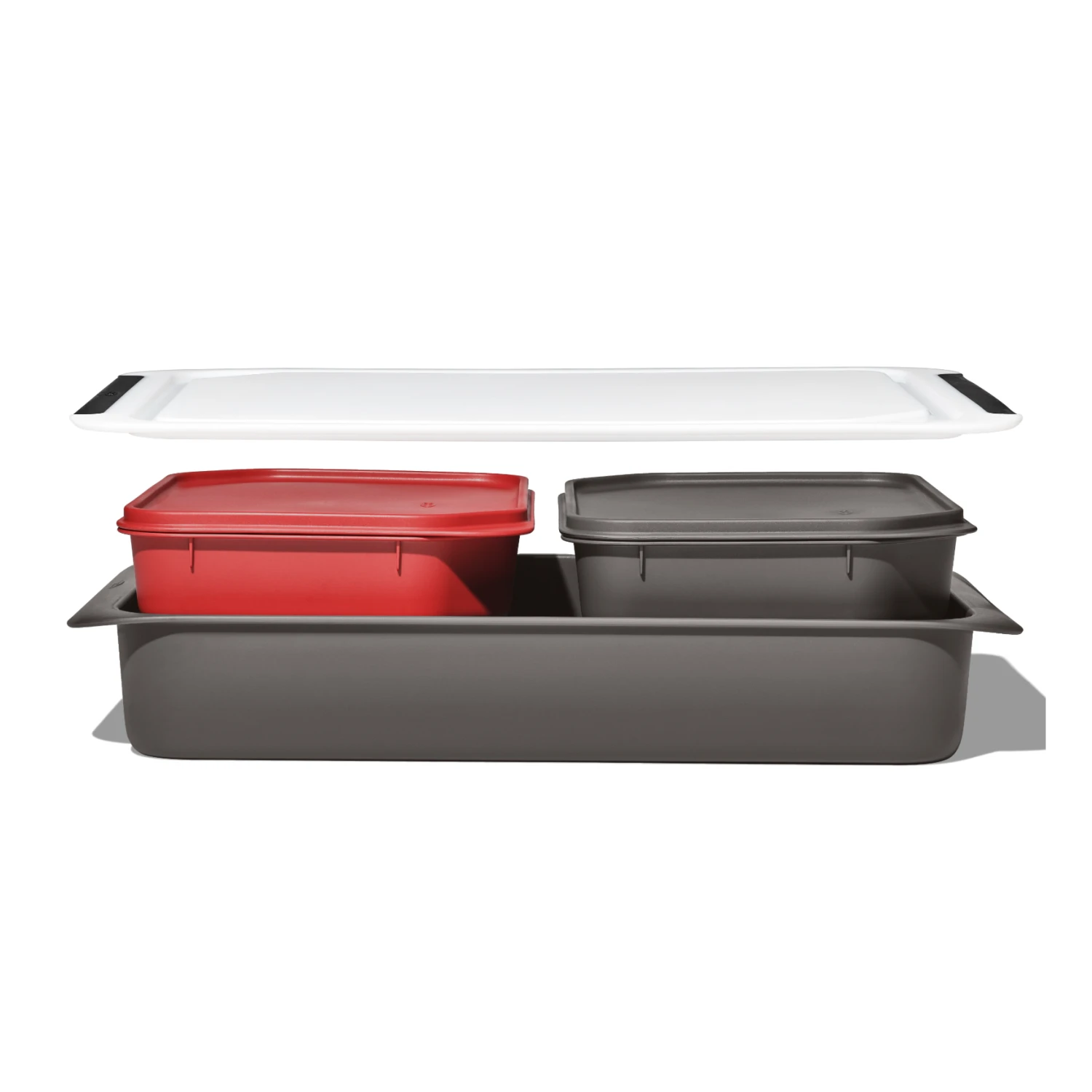 Do you love to grill but hate going back and forth from the kitchen to your grill? With the multifunctional OXO Outdoor Grilling Prep & Carry System you can prep, marinate, transport and serve with fewer trips to and from the grill. Deep Tray used for seasoning, carrying and serving your meats and vegetables. Large Cutting Board with non-slip accents is useful for prepping veggies and meats, or carving meats when they come off the grill. Deep juice grooves on the Cutting Board minimize the mess when carving meat. Trays with lids are color-coded for marinating without risking cross-contamination, to help keep raw and cooked or differently-seasoned food separate. Raised bottoms on the trays help to marinate food evenly and keep cooked food above juices and grease. Six-piece set includes Cutting Board, Deep Tray, two Trays with Lids. All-in-one set nests compactly for convenient storage. Dishwasher safe.