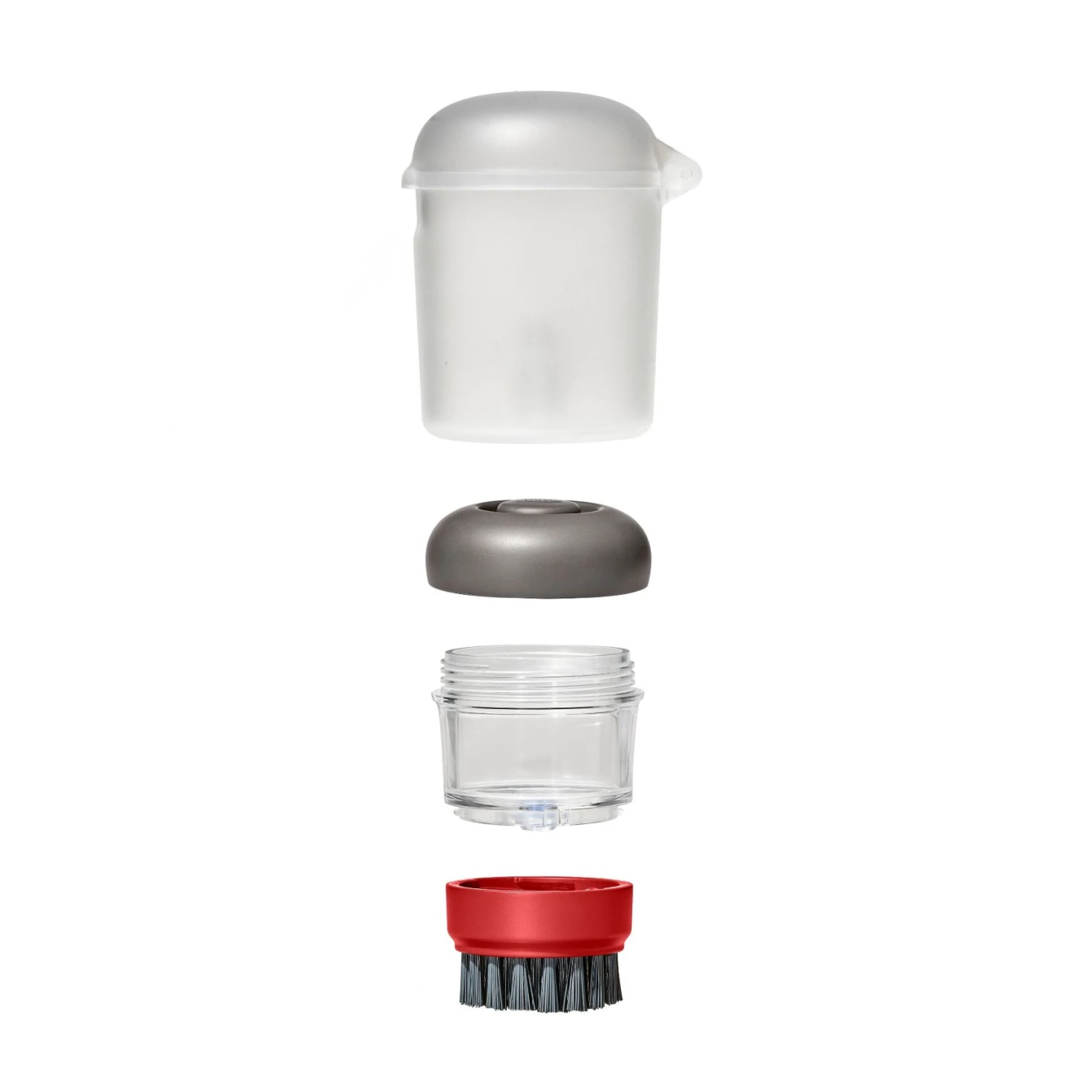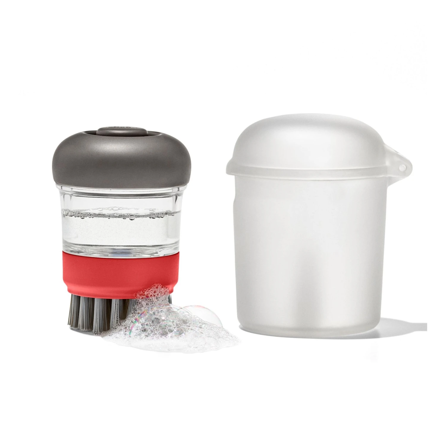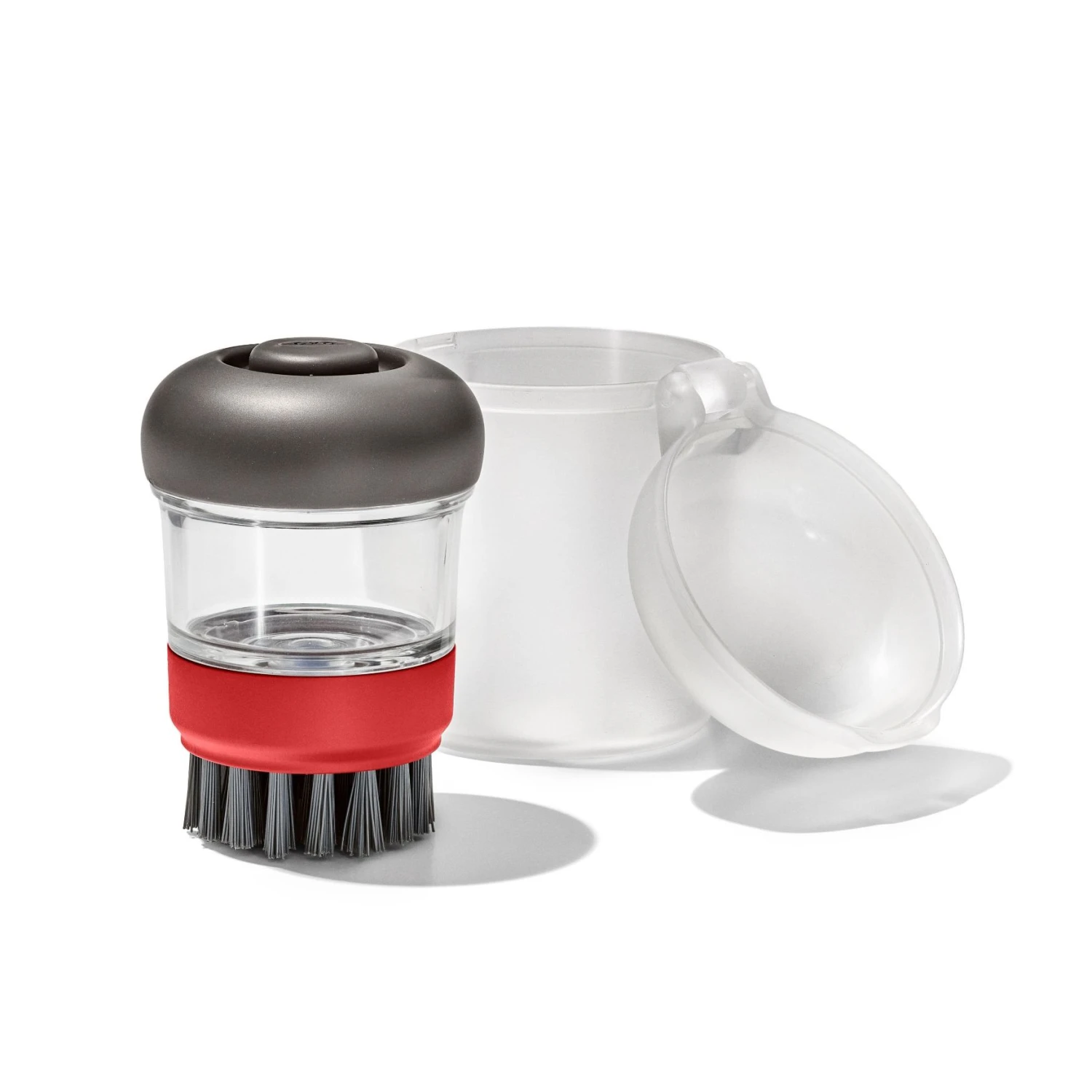 Whether it’s a campsite cookout, frying up fresh caught fish, the OXO Outdoor Soap Dispensing Brush with Storage Case can tackle any mess left behind. The palm-sized Brush has durable nylon bristles that are safe to use even on non-stick cookware, while the easy-press button dispenses just the right amount of soap each and every time. The convenient storage case includes an inner post to keep brush valve from dispensing soap while in storage. The case snaps shut to prevent it from accidentally opening. Replacement brush heads available. Dishwasher safe.