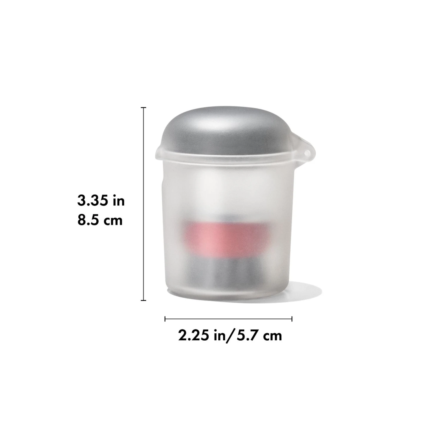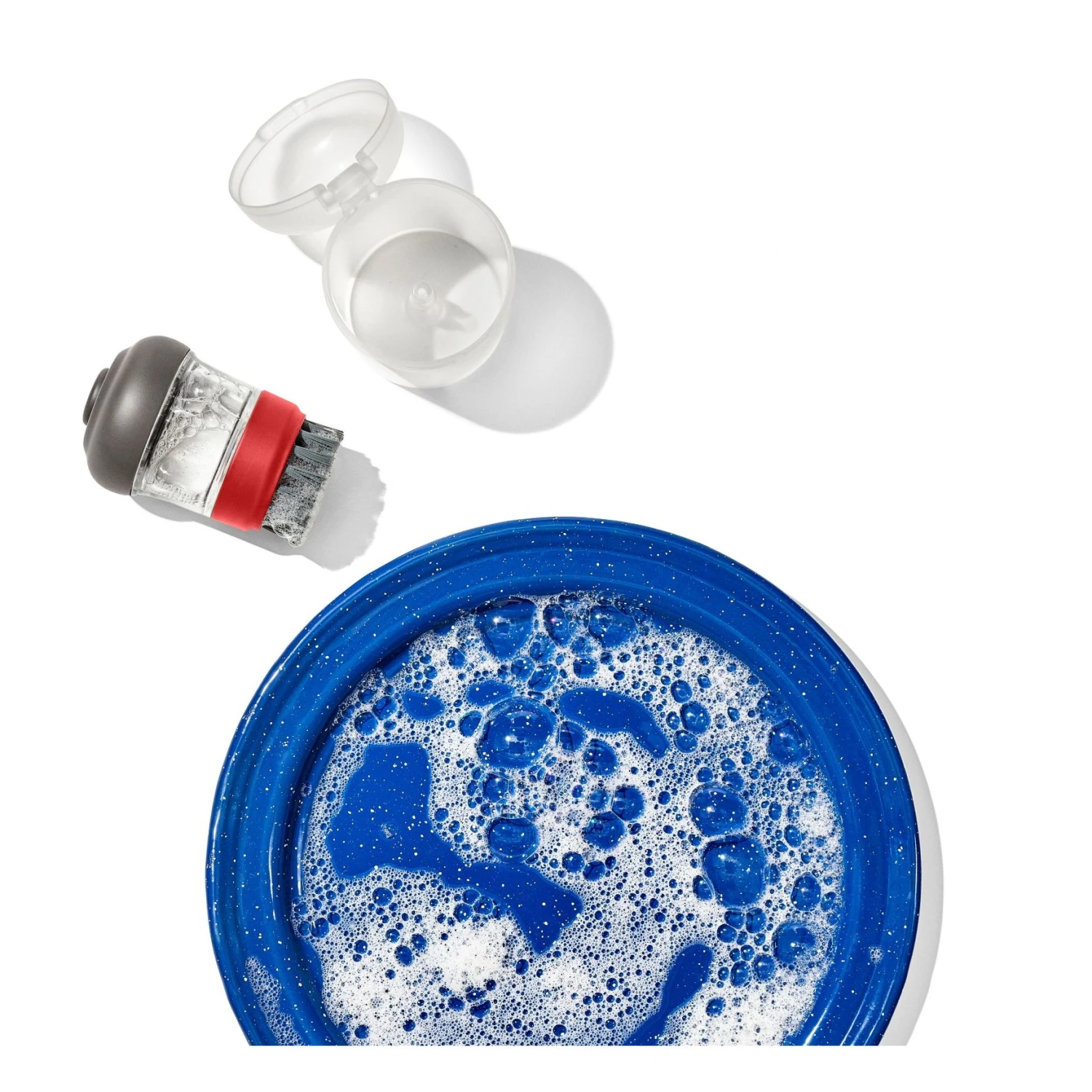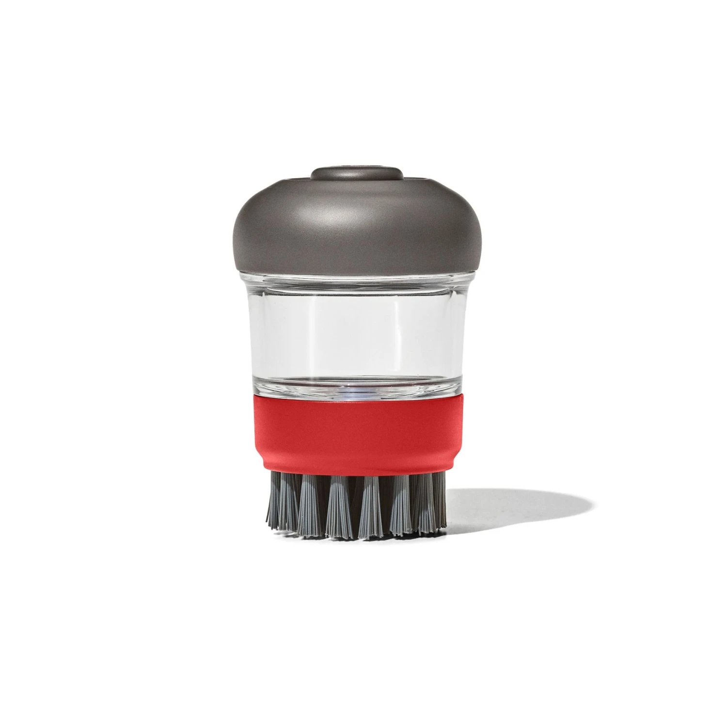 Whether it’s a campsite cookout, frying up fresh caught fish, the OXO Outdoor Soap Dispensing Brush with Storage Case can tackle any mess left behind. The palm-sized Brush has durable nylon bristles that are safe to use even on non-stick cookware, while the easy-press button dispenses just the right amount of soap each and every time. The convenient storage case includes an inner post to keep brush valve from dispensing soap while in storage. The case snaps shut to prevent it from accidentally opening. Replacement brush heads available. Dishwasher safe.