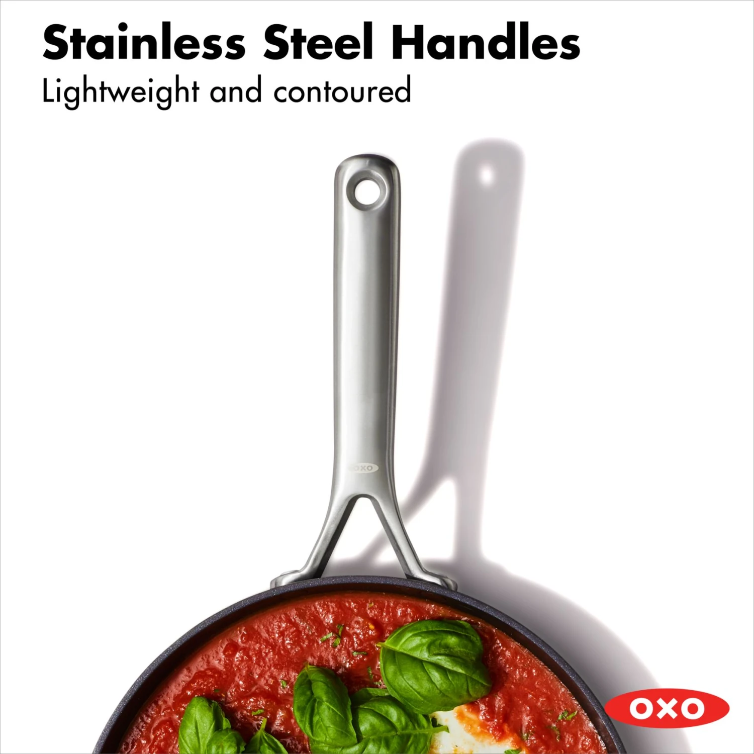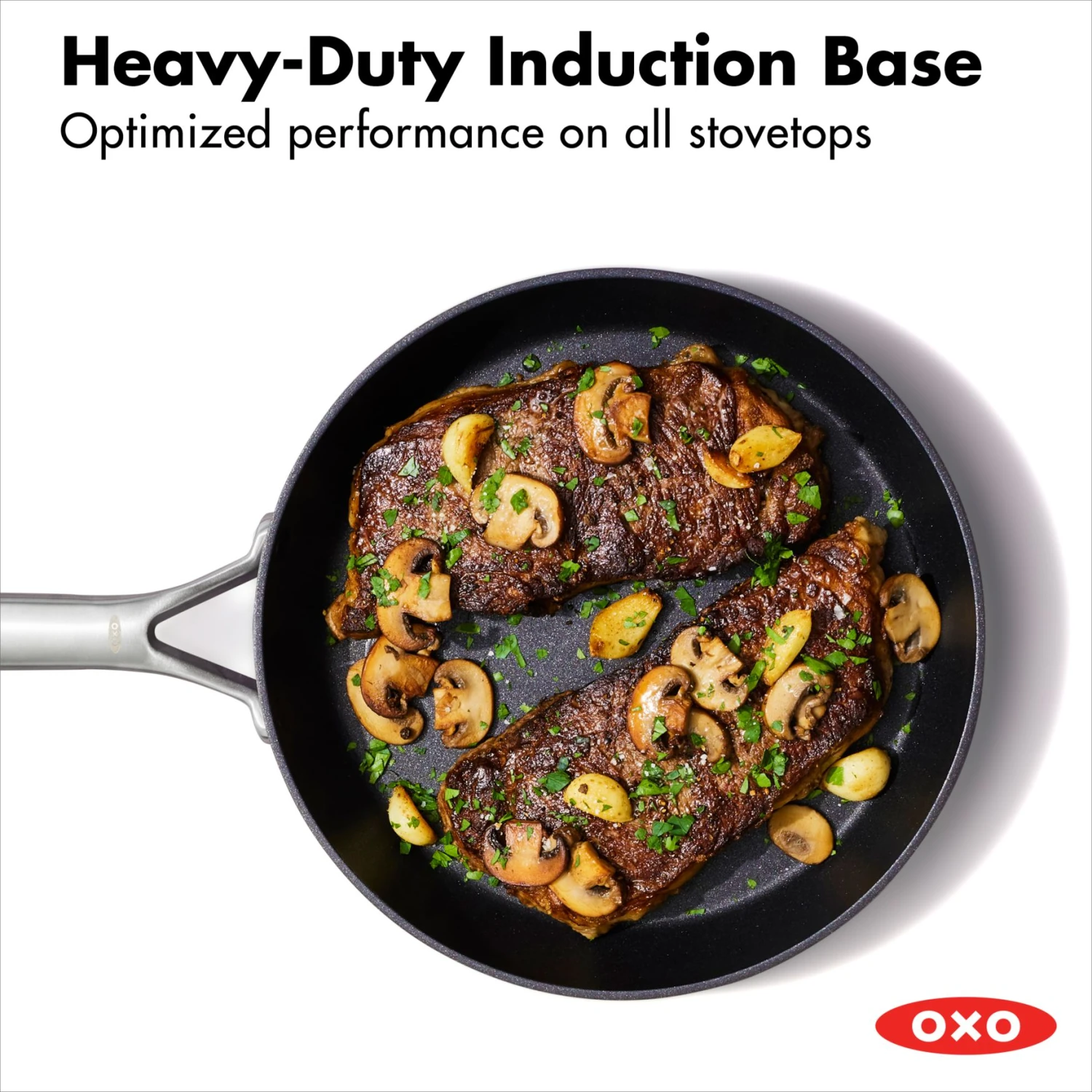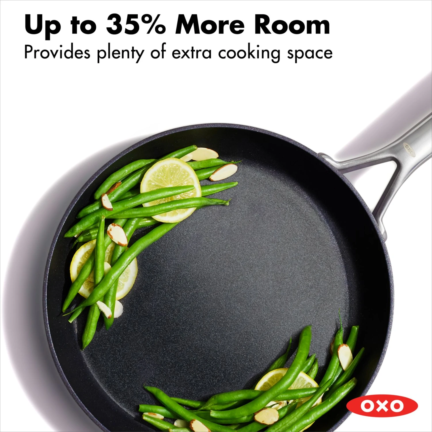 More room, better performance, incredible results—transform your cooking with the OXO Ceramic Professional Non-Stick 10-Inch Frypan. This pan features a diamond-reinforced ceramic non-stick coating that delivers better cooking results with less oil. Cleanup is easy, plus our ceramic non-stick coating is free of PFOA, lead and cadmium. This frypan’s scratch-resistant, hard-anodized body heats faster and more evenly than aluminum, and the thoughtfully designed shape means up to 35% more room. Optimized for any kitchen, this pan has a heavy-duty induction base for remarkable results on every stovetop. Oven safe up to 600?F. Dishwasher safe.