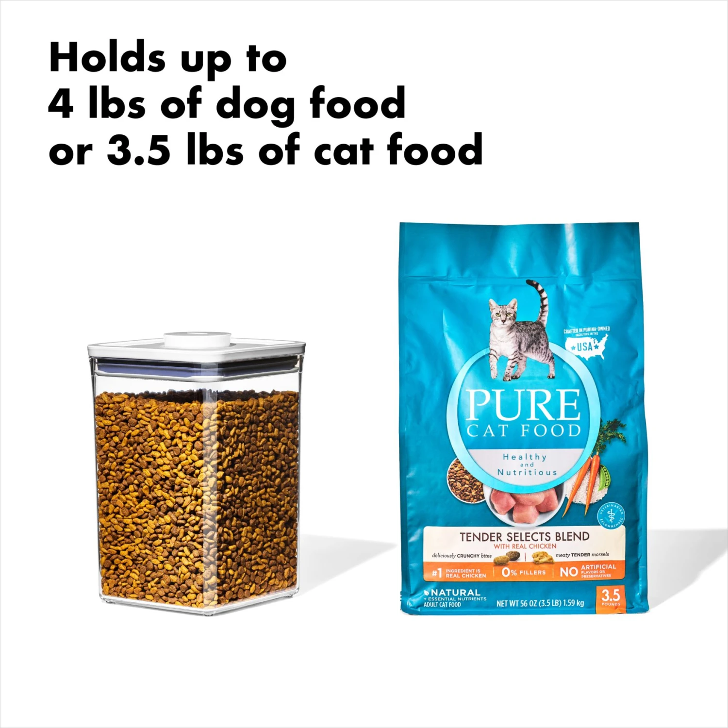 Who deserves the very best? Every single pet. And so we made this OXO 4.4 Qt Pet POP Container to hold their kibble and keep it fresh. It can store up to 4 pounds of dog food or 3.5 pounds of cat food. It has the classic POP Container lid, which creates an airtight seal (to keep pests and moisture out) and can easily be taken apart for cleaning. This Container also comes with a detachable ˝ cup scoop, for easy serving. And like all our square POP Containers, it can be neatly lined up or stacked to streamline the look of a shelf, counter or pantry. For best results, always use the button to open and close. Do not carry POP Containers by the lid. Dishwasher safe.Features Holds up to 4 pounds of dog food or 3.5 pounds of cat food Lid creates an airtight seal to keep food fresh and pests out Comes with a detachable ˝-cup scoop for easy serving Square footprint allows for stacking and modular storage Always use the button to open and close; do not carry Container by the lid Lid comes apart for easy cleaning; dishwasher safe