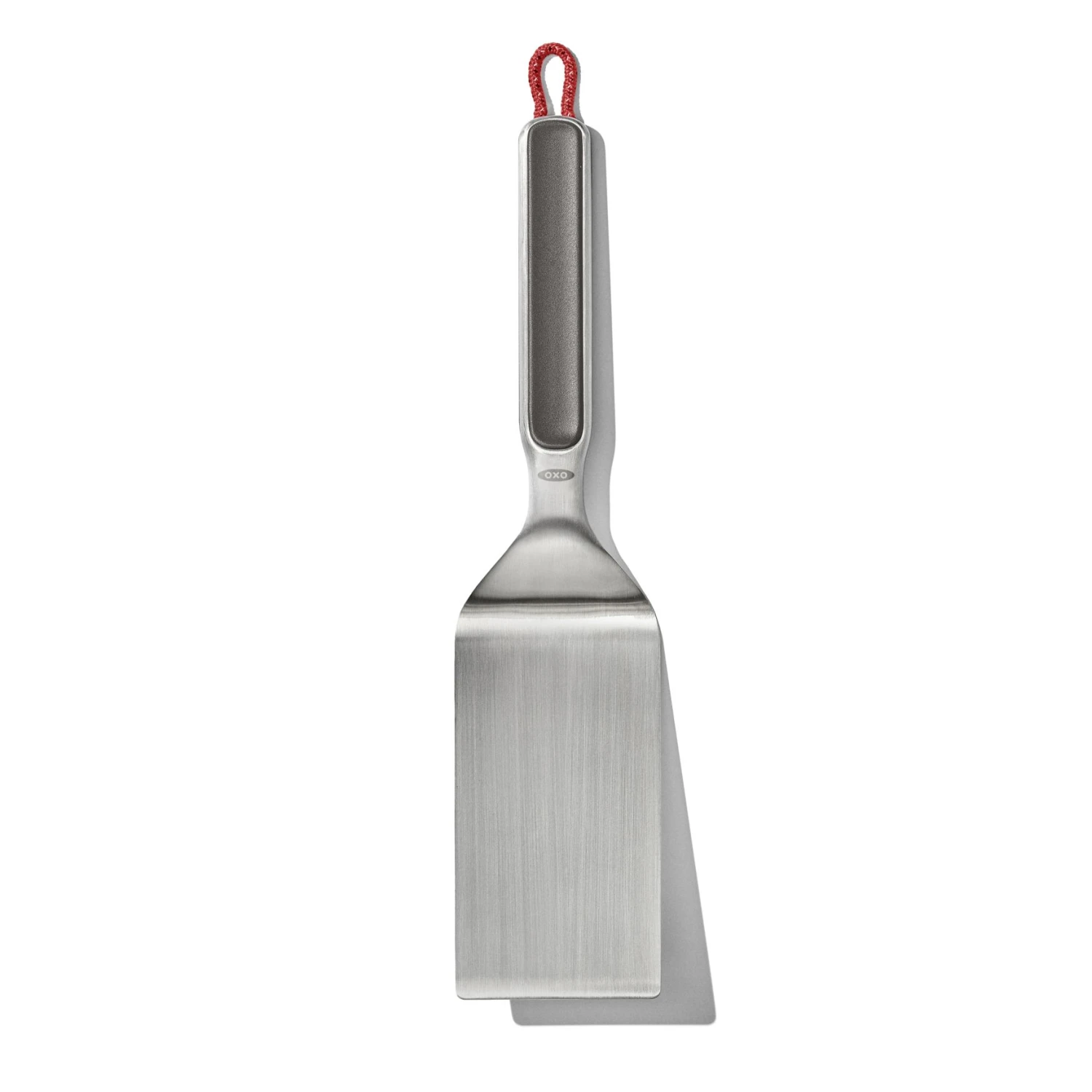 Upgrade your campsite breakfasts with the OXO Outdoor Camp Stove Griddle Turner. It has a wide, professional-quality stainless steel head that can slide under pancakes on a griddle, scramble eggs in a cast iron skillet or serve hash browns from a stainless steel fry pan. It also has a non-slip handle for a secure grip (even if your hands are wet) and a reflective hanging loop (to help you spot it the in the dark). Dishwasher safe.Features Wide, flexible head slides under pancakes, omelets, scrambled eggs and hash browns Professional-quality stainless steel head For use with cast iron, carbon steel and stainless steel cookware. Not recommended for non-stick cookware. Non-slip handles provide a secure grip, even if your hands are wet Reflective hanging loop is easy to spot in crowded kits Dishwasher Safe