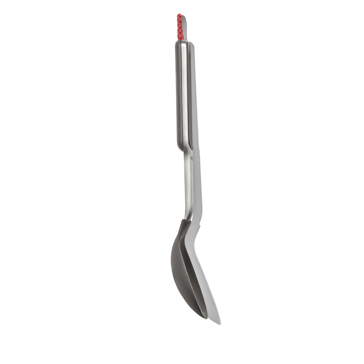 The OXO Outdoor Silicone Camp Stove Spoon can stir up a big pot of chili, serve piping hot oatmeal and more. The high-heat resistant, silicone head is safe to use on all types of cookware and the Spoon’s flexible edges have been designed to scrape up every last bit of food. The Spoon also has a non-slip handle for a secure grip (even if your hands are wet) and a reflective hanging loop (to help you spot it the in the dark). Dishwasher safe.Features High-heat resistant spoon head is made of food-safe silicone and perfect for cooking on camp stoves Safe for all cookware—including non-stick and cast iron Flexible silicone edges scrape up every last bit from cookware Non-slip handles provide a secure grip, even if your hands are wet Reflective hanging loop is easy to spot in crowded kits Dishwasher Safe