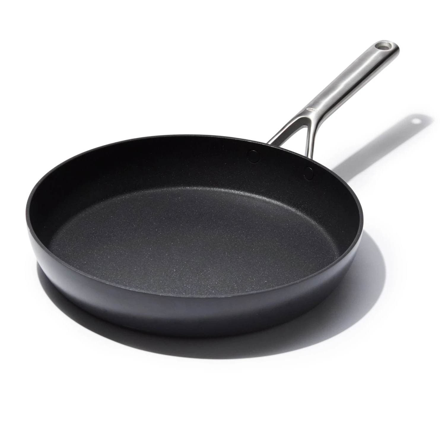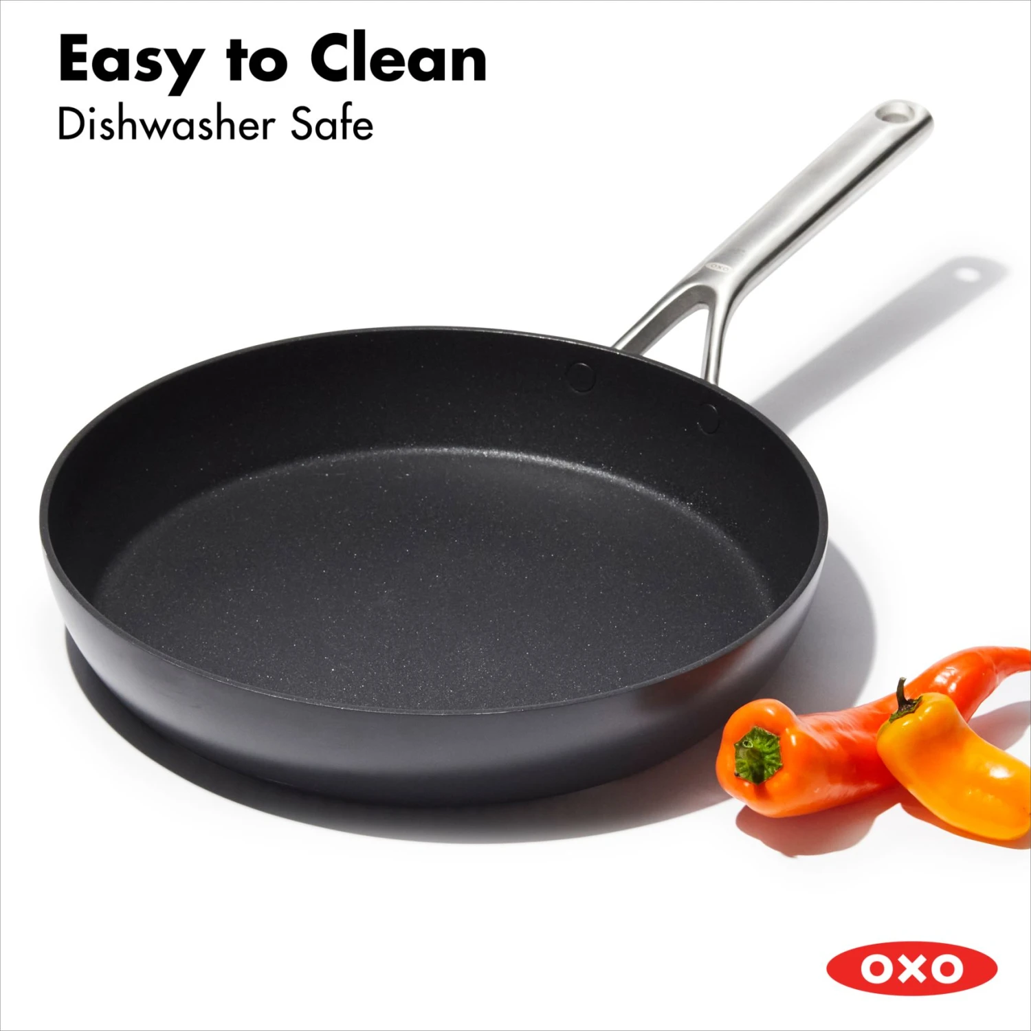 Get more room and better performance with the OXO Ceramic Professional Non-Stick 12-In Frypan. This pan features a diamond-reinforced ceramic non-stick coating that delivers effortless food release with less oil. Cleanup is easy, plus our ceramic non-stick coating is free of PFOA, lead and cadmium. This pan’s scratch-resistant, hard-anodized aluminum body heats faster and more evenly than traditional aluminum, and the thoughtfully designed shape means up to 35% more room to cook. Optimized for any kitchen, this pan has a heavy-duty induction base that works on every stovetop and it’s dishwasher safe.