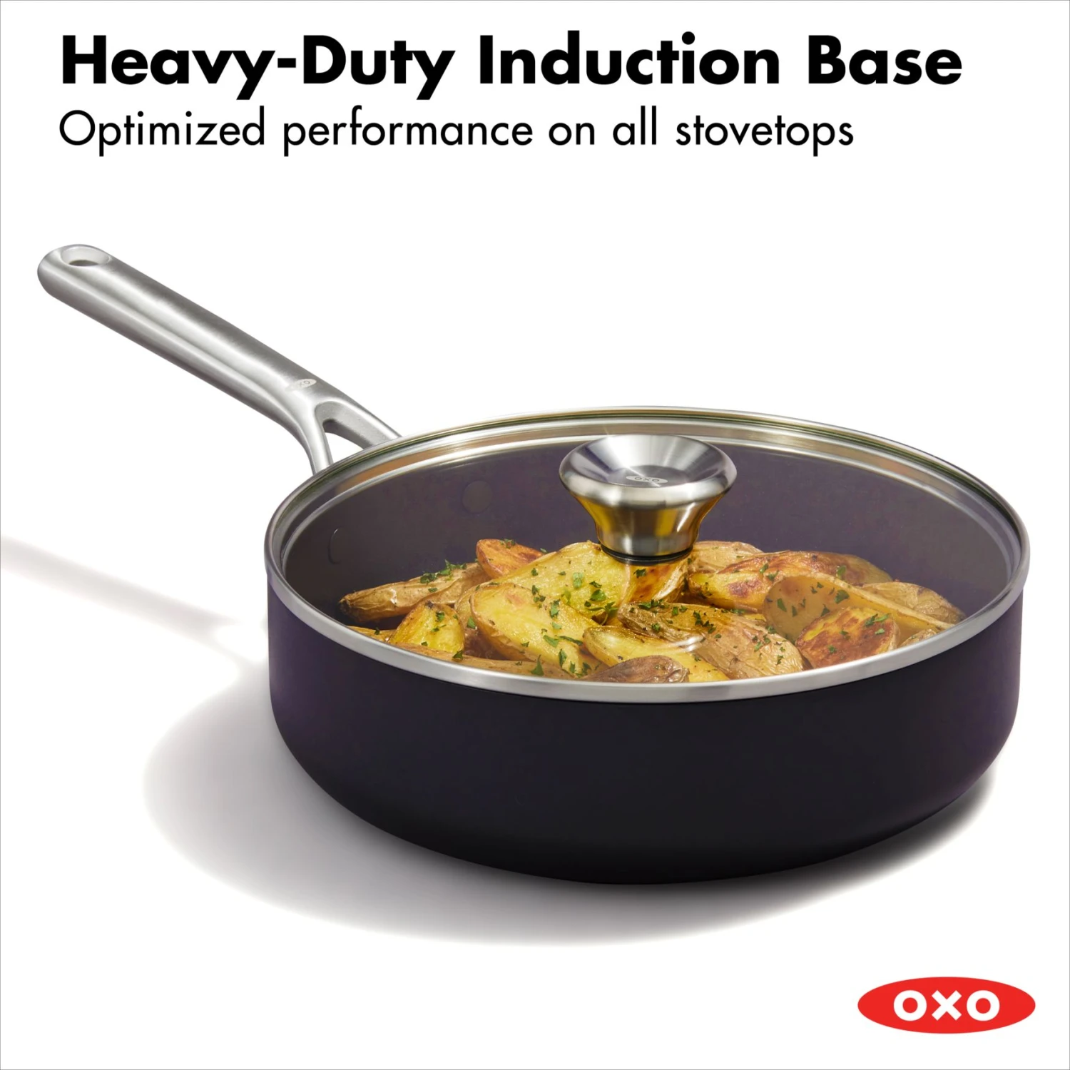 Get more room and better performance with the OXO Ceramic Professional Non-Stick 3-Quart Sauté Pan with Lid. This pan features a diamond-reinforced ceramic non-stick coating that delivers effortless food release with less oil. Cleanup is easy, plus our ceramic non-stick coating is free of PFOA, lead and cadmium. This pan’s scratch-resistant, hard-anodized aluminum body heats faster and more evenly than traditional aluminum, and the tempered glass lid lets you keep an eye on your meal without losing heat. Optimized for any kitchen, this pan has heavy-duty induction base that works on every stovetop and it’s dishwasher safe.