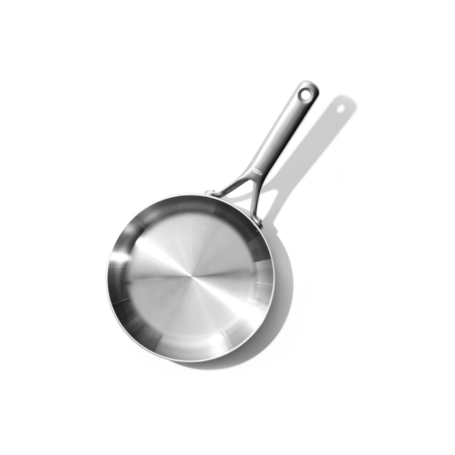 The OXO Tri-Ply Stainless Mira Series is a line of cookware that features two layers of stainless steel with a heat-radiant aluminum core, a combination that evenly distributes heat for uniform cooking, all while being metal utensil. The stain-resistant finish features evershine technology to help prevent heat discoloration and keep your pan looking good as new. The lightweight, contoured stainless steel handle provides a comfortable grip while cooking, and the 8-in Fry Pan is perfect for frying eggs, searing fish, or cooking chicken. The rivets are streamlined for a seamless, snag-free interior which makes for effortless cleanup. The Pan is induction ready, oven safe up to 600°F/325.5°C and dishwasher safe.