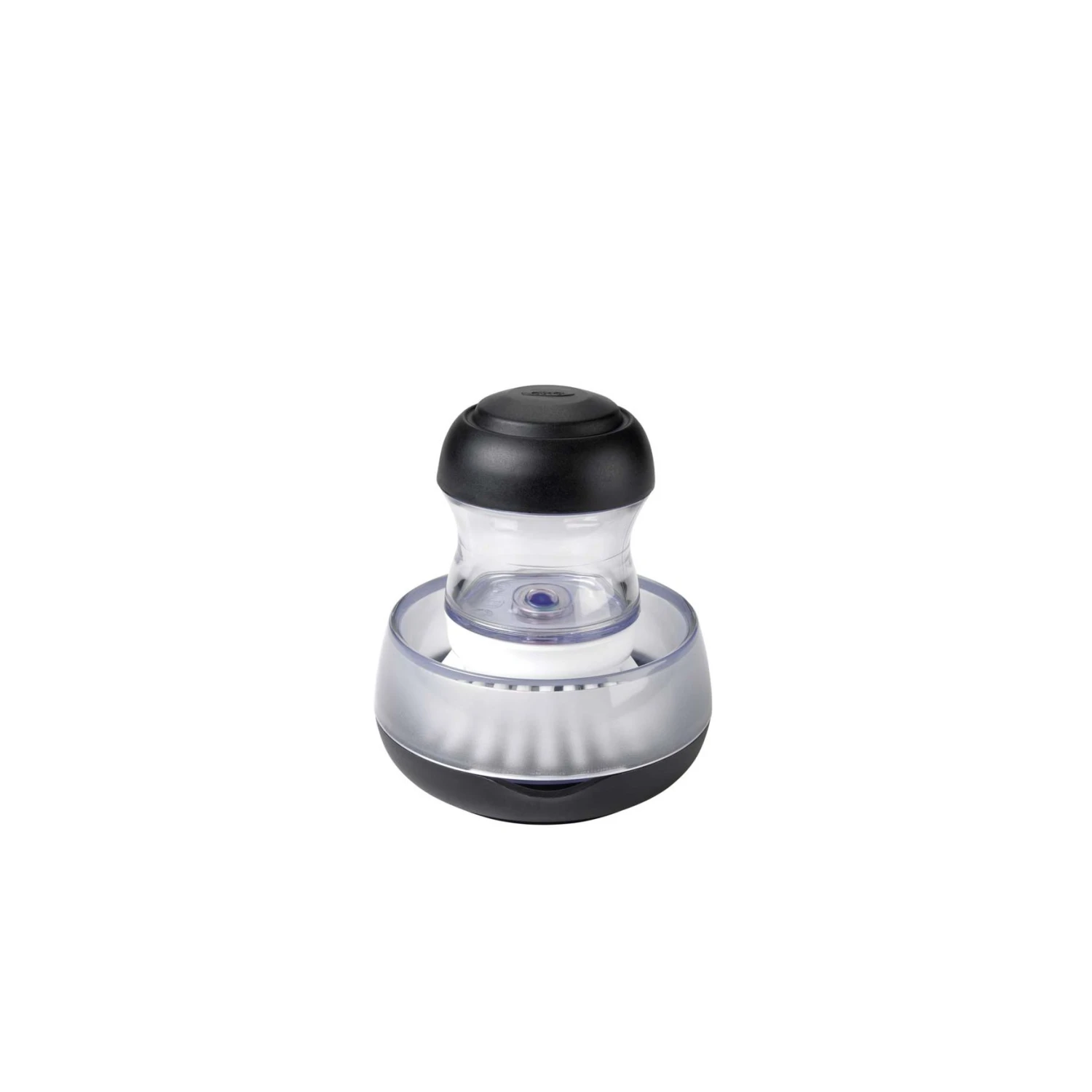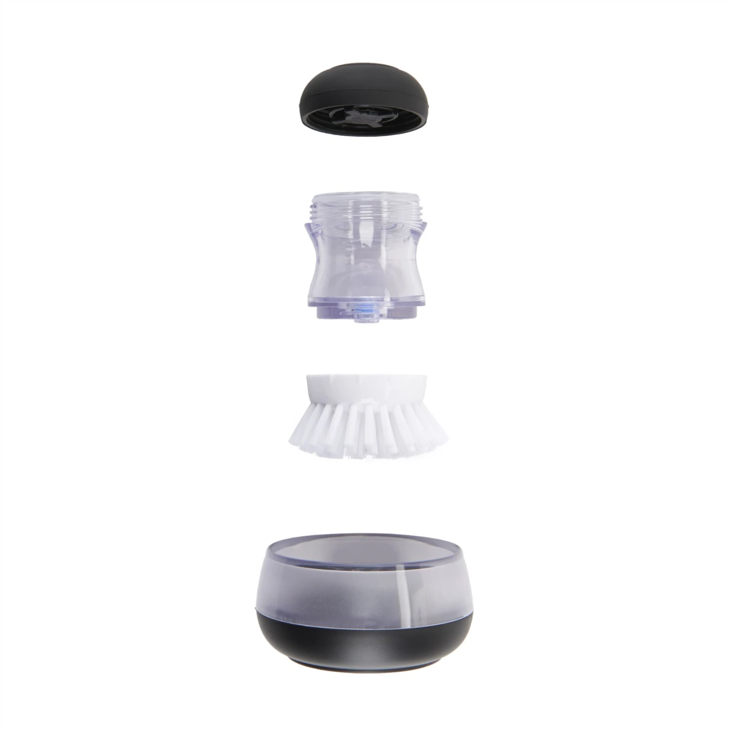 Includes a Soap Dispensing Palm Brush and a companion holder to catch excess water. Holder features a removable drip tray and built-in pour spout to keep counters clean and dry. A non-skid base keeps the holder in place. Brush has durable nylon bristles that are safe to use on non-stick cookware.