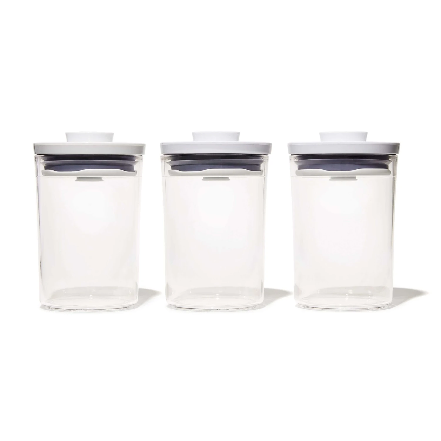 Keep cotton balls, hair accessories and makeup tools tidy with the OXO Good Grips Round POP Container 3-Piece Set. Each Container has a push-button lid that creates an airtight seal—and the button pops up for easy, one-handed opening. POP Containers aren’t just for bathrooms: Use them any place you want more organization. Each Container is designed to fit household staples like cereal, flour, sugar, pasta, rice, coffee, nuts, snacks and more. For best results, always use the button to open and close. Do not carry POP Containers by the lid. BPA free. Dishwasher safe. Set includes: three 0.6 Qt/0.6 L Containers