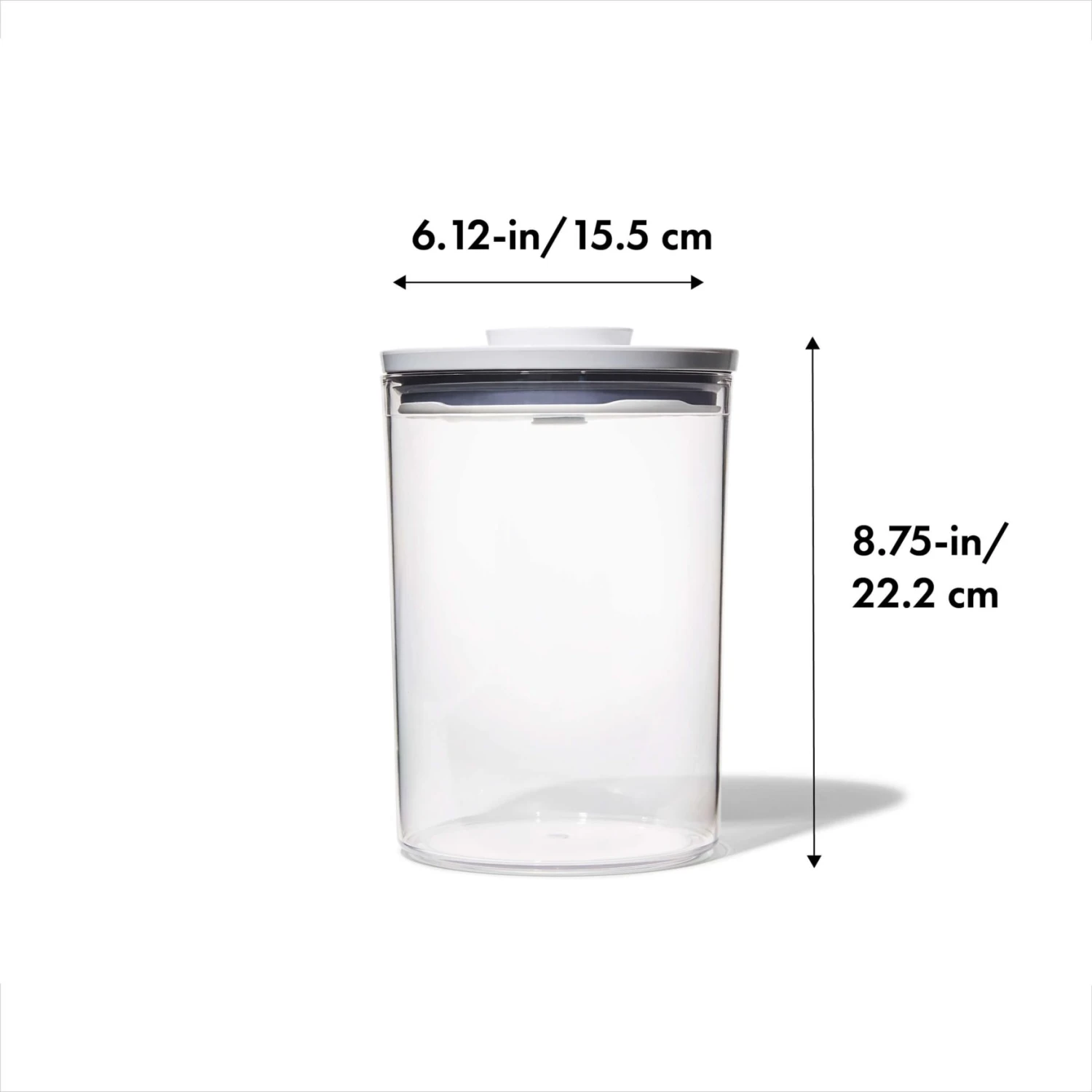 Keep dry foods and ingredients fresh and close at hand with the OXO Good Grips 3.3 Qt/3.1 L POP Round Container. The Container has a push-button lid that creates an airtight seal—and doubles as a handle for easy, one-handed opening. POP Round Containers are perfectly calibrated to store common household staples like cereal, flour, sugar, pasta, rice, coffee, nuts, snacks and more. They nest with lids on for convenient storage. POP Containers aren’t just for kitchens: Use them any place you want more organization. For best results, always use the button to open and close. Do not carry POP Containers by the lid. BPA free. Dishwasher safe.