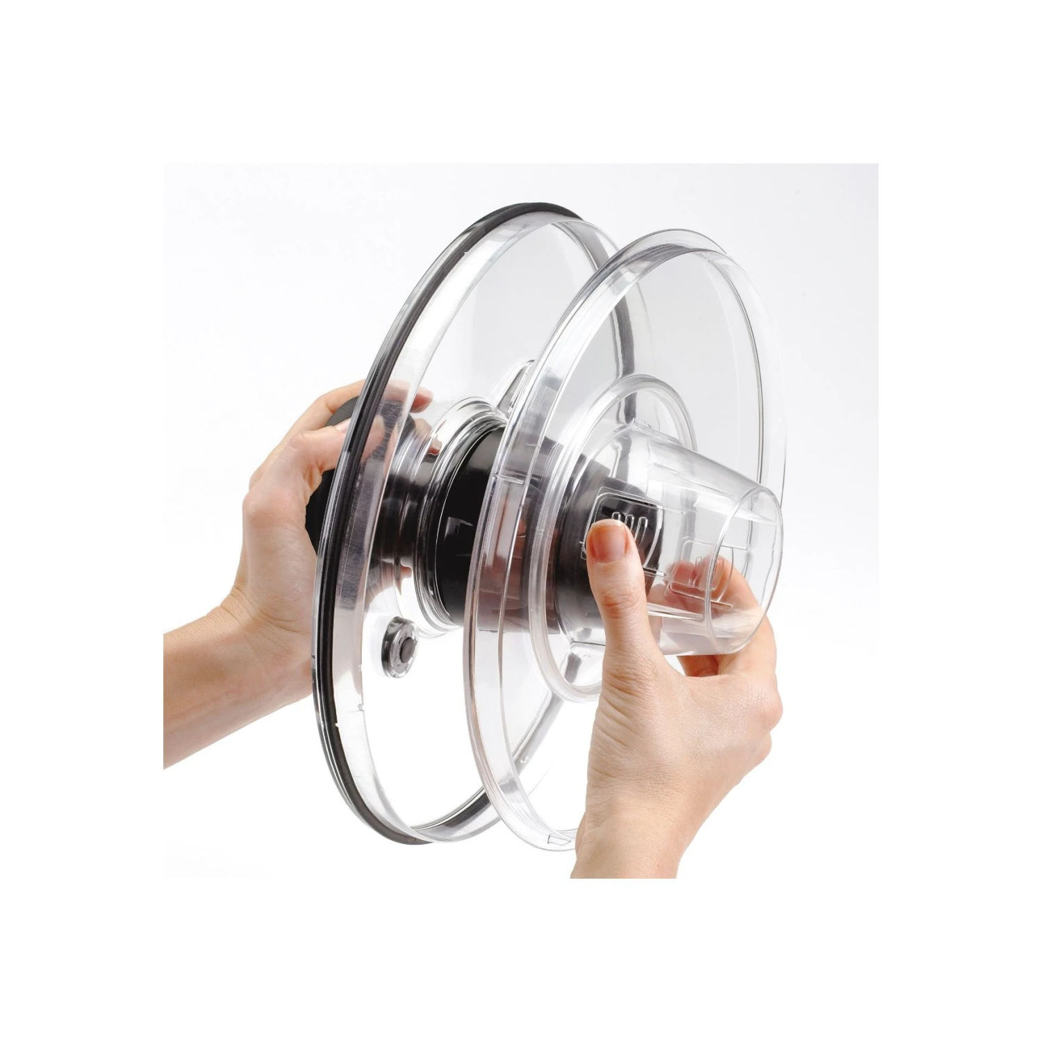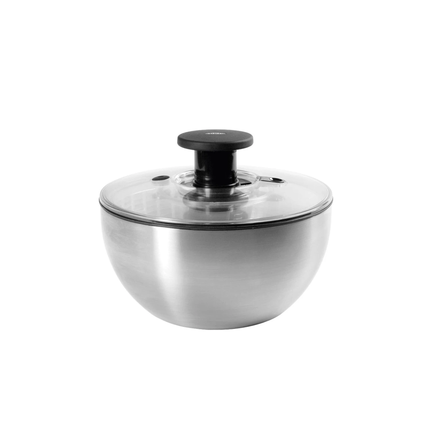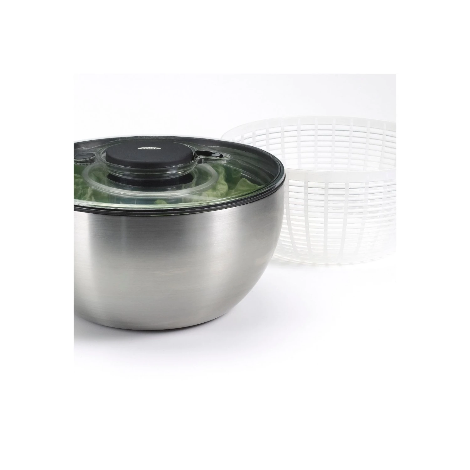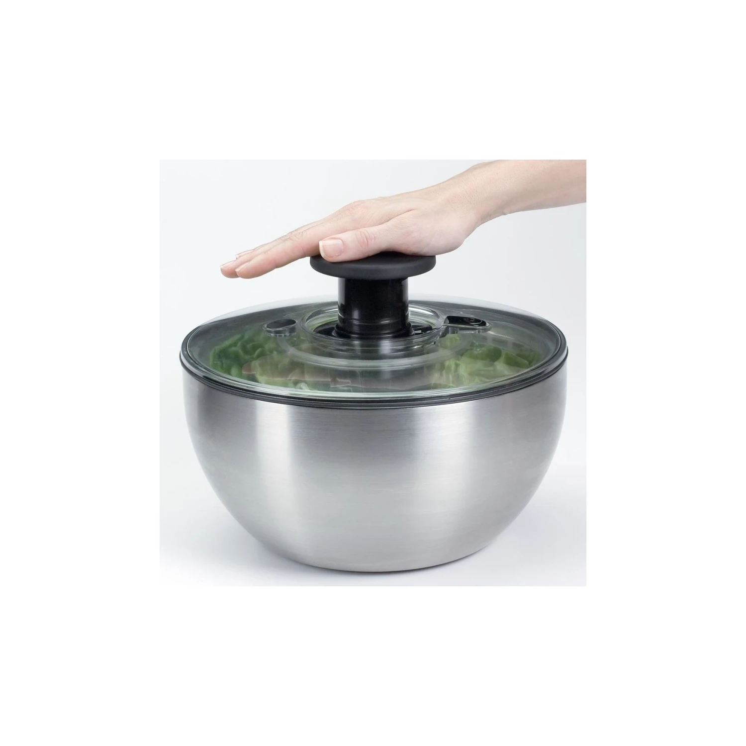 Dry salad greens with a simple press of the soft, non-slip knob. The non-slip base keeps the bowl steady on the countertop and the built-in brake button stops the Salad Spinner for unloading. The stainless steel bowl is perfect for serving salad, and the basket doubles as a colander. The lid comes apart for easy cleaning.