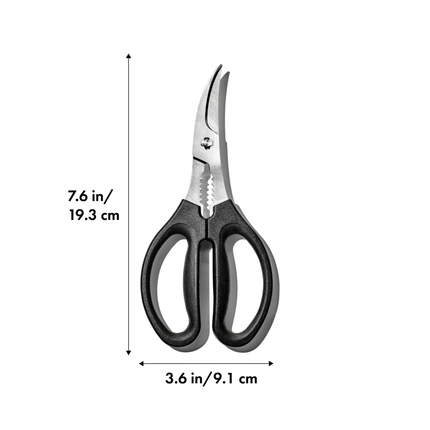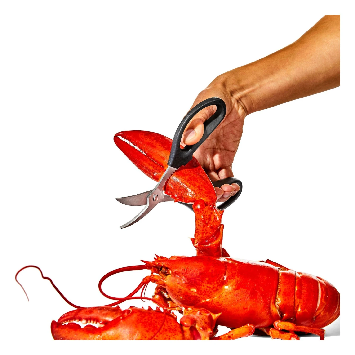 The OXO Good Grips Seafood Scissors make cutting through shells and fish a breeze. Featuring a special curved design for lobster tails, crab claws and shrimp and a built-in cracker between the handles for all-in-one convenience. With soft, comfortable handles these sheers won’t slip even when your hands are wet. WARNING: Product is very sharp. Handle with care when unpacking, using, cleaning and storing. Keep out of reach of children
