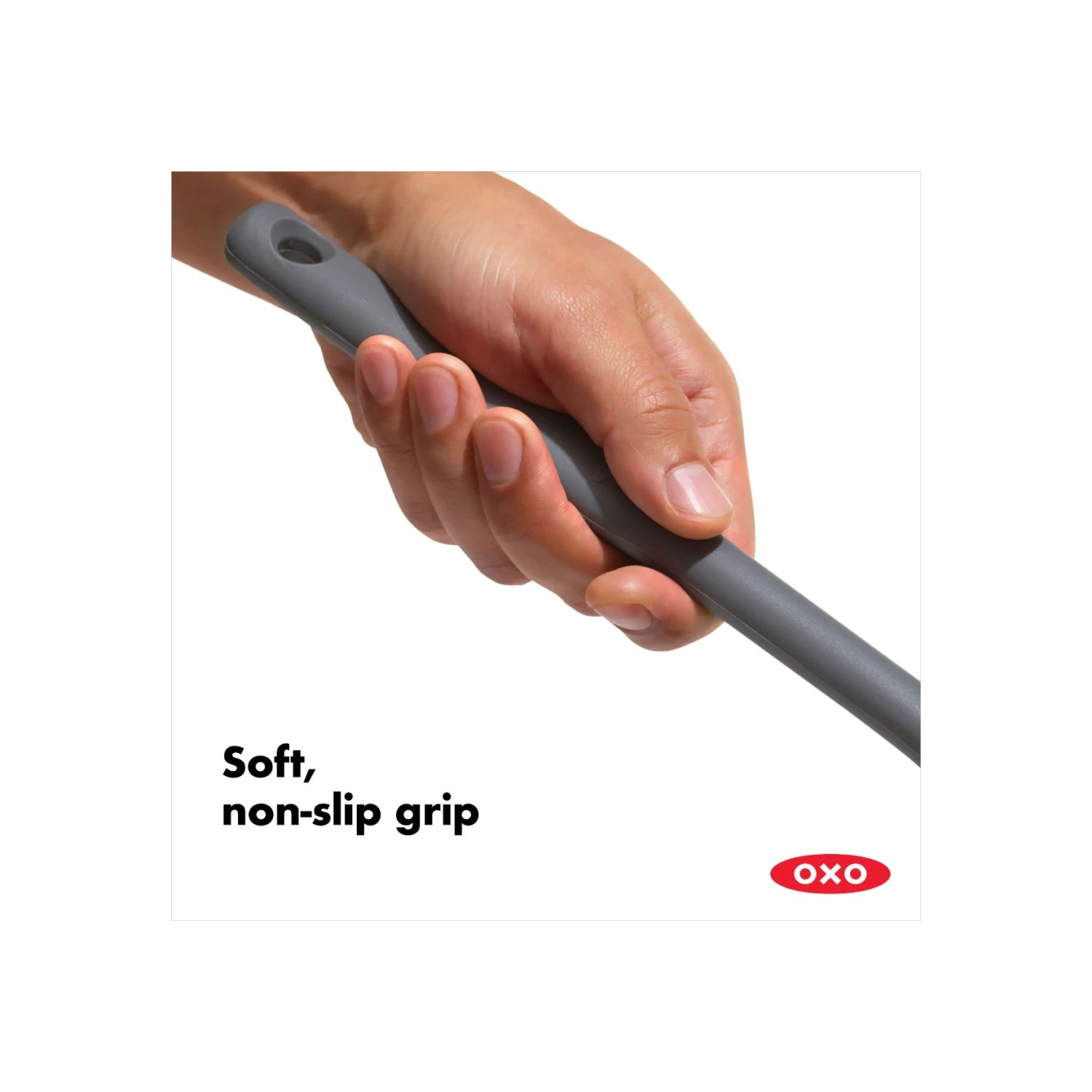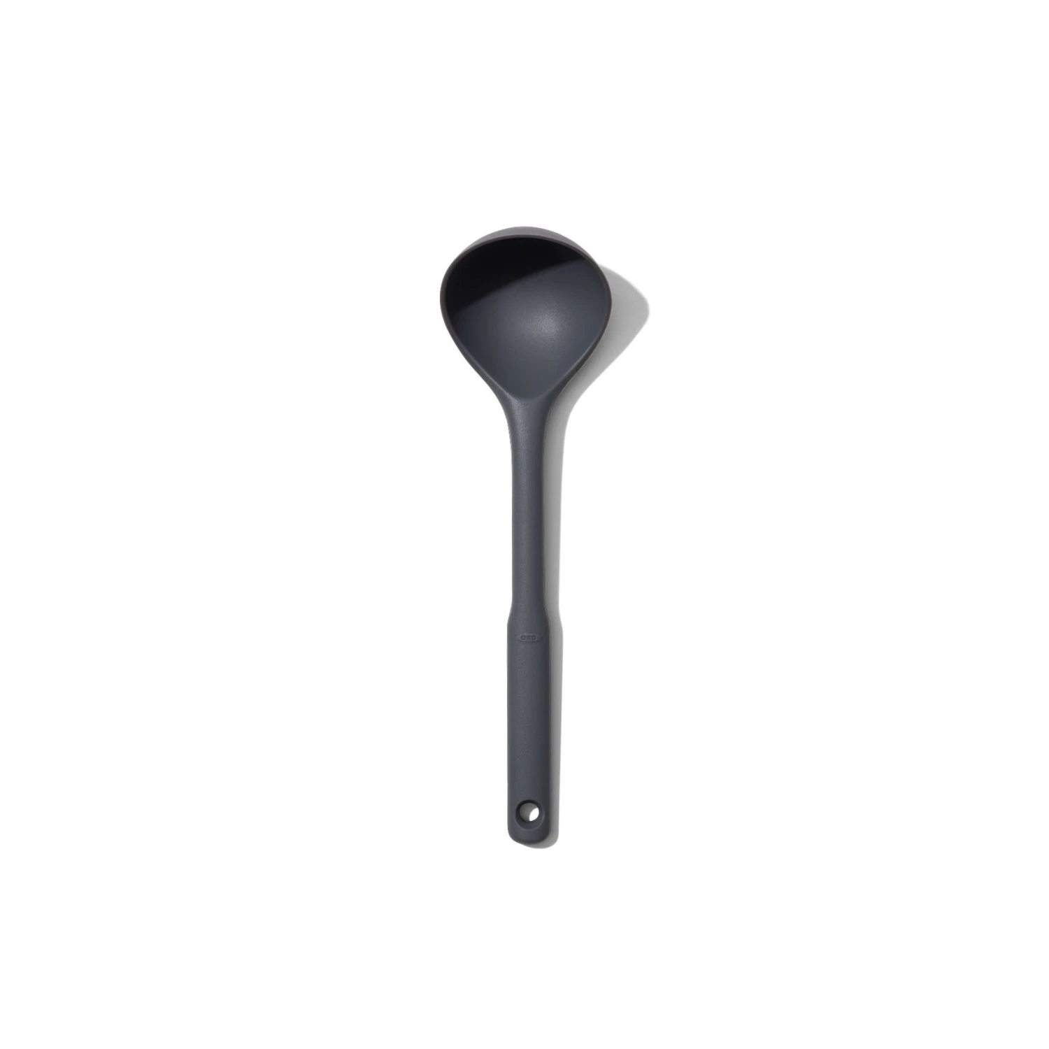 With the OXO Good Grips Silicone Everyday Ladle, it’s never a struggle to get every last spoonful of soup or spaghetti sauce out of the pot and into your dish. The flexible front and sides bend to conform to the curve of your pot, so you can easily scoop out all of your delicious cooking to serve or store in the fridge for later. The ladle is generously sized, with square edges that stop drips and create a cleaner pouring surface. The unique angled design and sturdy central core keep liquid where it belongs when scooping and placing food into bowls. The soft, non-slip grip is comfortable in your hand, no matter how many helpings of chili you serve to your guests. Heat-safe silicone is gentle on non-stick cookware and is dishwasher safe, so cleanup is a breeze.