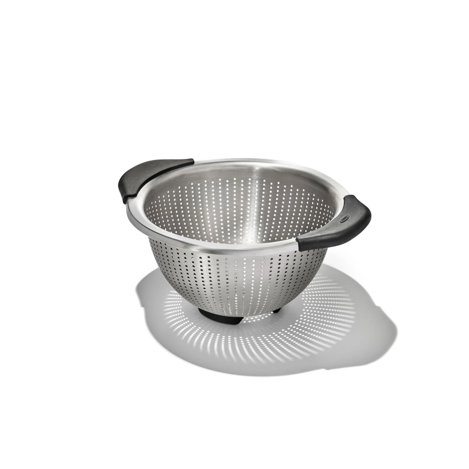 Whether you’re rinsing veggies or straining pasta, the OXO Good Grips 3-Qt Stainless Steel Colander is ready for the job. Elevated, non-slip handles provide a firm and comfortable grip, even when handling large batches. Our Colander is constructed with three feet at the base that deliver stability in the sink and on the countertop and nest neatly in our Stainless Steel Mixing Bowls for convenient straining and storage. The perforated design ensures fast and thorough straining. Also available in 5-qt size.